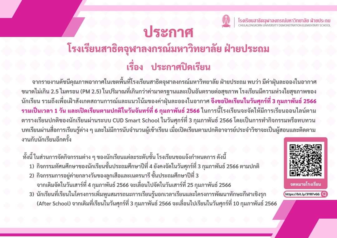 จากรายงานดัชนีคุณภาพอากาศในเขตพื้นที่โรงเรียนสาธิตจุฬาลงกรณ์มหาวิทยาลัย ฝ่ายประถม พบว่า มีค่าฝุ่นละอองในอากาศขนาดไม่เกิน 2.5 ไมครอน (PM 2.5) ในปริมาณที่เกินกว่าค่ามาตรฐานและเป็นอันตรายต่อสุขภาพ โรงเรียนมีความห่วงใยสุขภาพของนักเรียน รวมถึงเพื่อเฝ้าสังเกตสถานการณ์และแนวโน้มของค่าฝุ่นละอองในอากาศ จึงขอปิดเรียนในวันศุกร์ที่ 3 กุมภาพันธ์ 2566 รวมเป็นเวลา 1 วัน และเปิดเรียนตามปกติในวันจันทร์ที่ 6 กุมภาพันธ์ 2566 ในการนี้โรงเรียนจะจัดให้มีการเรียนออนไลน์ตามตารางเรียนปกติของนักเรียนผ่านระบบ CUD Smart School ในวันศุกร์ที่ 3 กุมภาพันธ์ 2566 โดยเป็นการทำกิจกรรมหรือทบทวนบทเรียนผ่านสื่อการเรียนรู้ต่าง ๆ และไม่มีการนับจำนวนผู้เข้าเรียน เมื่อเปิดเรียนตามปกติอาจารย์ประจำวิชาจะเป็นผู้สอนและติดตามงานกับนักเรียนอีกครั้ง