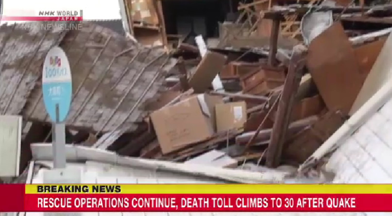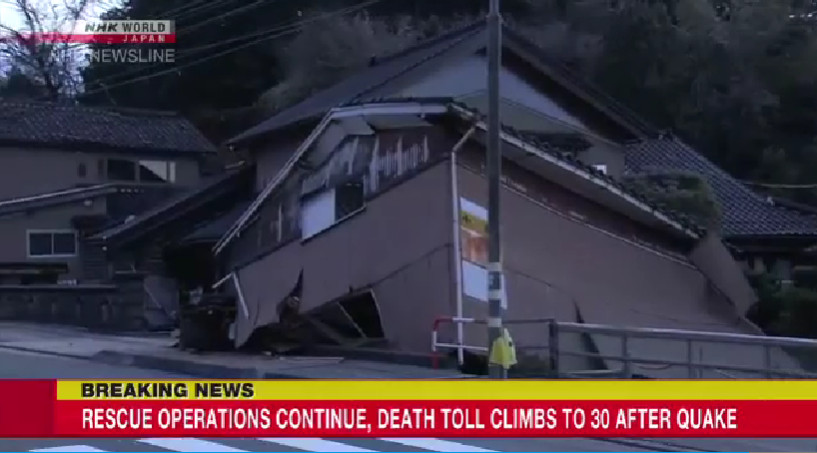 สำนักข่าว NHK ของญี่ปุ่นรายงานว่า ปฏิบัติการกู้ภัยยังคงดำเนินการอยู่หลังจากเกิดแผ่นดินไหวร้ายแรงที่จังหวัดอิชิกาวะ ทางตอนกลางของญี่ปุ่น ในวันปีใหม่ มีผู้เสียชีวิตแล้วอย่างน้อย 30 รายในจังหวัดอิชิคาวะ แต่จำนวนดังกล่าวยังคงอาจเพิ่มขึ้นอีก เนื่องจากยังมีอีกจำนวนมากที่ยังคงติดอยู่ใต้อาคารที่พังทลาย สำนักงานอุตุนิยมวิทยาของญี่ปุ่นยกเลิกคำแนะนำเกี่ยวกับสึนามิตามแนวทะเลญี่ปุ่นทั้งหมด หลังจากเกิดแผ่นดินไหวรุนแรงในพื้นที่เมื่อบ่ายวันจันทร์ แต่เจ้าหน้าที่เตือนว่าอาฟเตอร์ช็อกรุนแรงอาจเกิดขึ้นในสัปดาห์หน้า โดยเฉพาะในช่วง 2-3 วันข้างหน้า