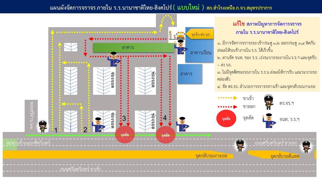 พ.ต.อ.วิโรจน์ ตัดโส ผกก.สภ.สำโรงเหนือ พ.ต.ท. สิทธิชัย ปลื้มประเสริฐ สว.จร. สภ.สำโรงเหนือ ร่วมคณะผู้บริหาร ร.ร.นานาชาติไทย-สิงคโปร์ ร่วมจัดการจราจรเพื่อแก้ไขปัญหาการจราจร บริเวณ ร.ร.นานาชาติไทย-สิงคโปร์ กรณี รถรับ - ส่ง นักเรียนมีท้ายสะสมกระทบการจราจรในถนนศรีนครินทร์ ฝั่งขาออก โดยมีข้อดำเนินการแก้ไข เร่งด่วน ดังนี้