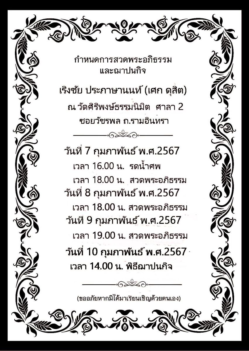 โดยทางครอบครัวแจ้งว่าจะมีกำหนดรดน้ำศพ ในวันที่ 7 ก.พ.2567 เวลา 16.00 น. และกำหนดสวดพระอภิธรรมศพ วันที่ 7, 8 ก.พ. เวลา 18.00 น. วันที่ 9 ก.พ.2567 เวลา 19.00 น. ณ วัดศิริพงษ์ธรรมนิมิต ศาลา 2 ซอยวัชรพล ถนนรามอินทรา แขวงท่าแร้ง เขตบางเขน และกำหนดการพิธีฌาปนกิจ ในวันที่ 10 ก.พ.2567 เวลา 14.00 น.