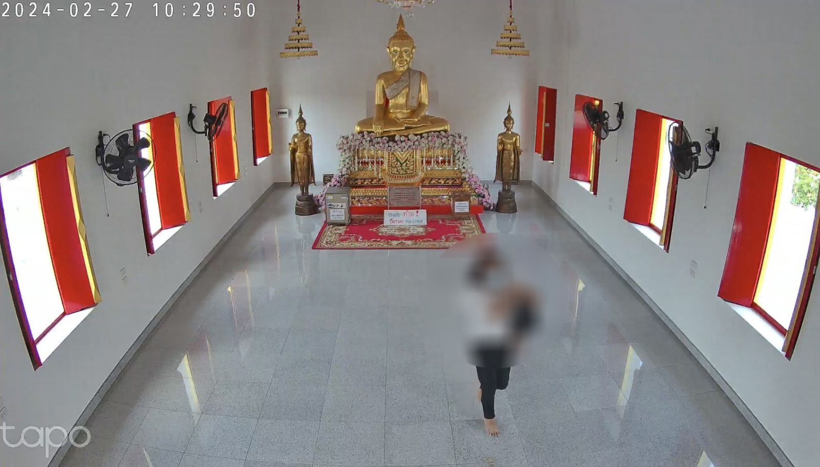 กล้องวงจรปิดสามารถบันทึกภาพขณะหญิงคนดังกล่าวขับรถมาจอดที่ลานจอดรถ จากนั้นได้เดินเข้าไปไหว้พระ และได้มีการสอบถามพูดคุยกับพระที่นั่งอยู่บริเวณนั้น ขณะเดียวกันคนร้ายได้ทำทีนำเงินจำนวน 20 บาท ไปเสียบไม้ที่ทางวัดจัดไว้ให้กับผู้คนที่มาทำบุญ ส่วนกล้องตัวที่อยู่ในพระอุโบสถ บันทึกภาพคนร้ายเดินเข้ามาในพระอุโบสถ จากนั้นก็เดินไปนั่งตรงหน้าตู้บริจาค ใช้อุปกรณ์ที่เตรียมมางัดตู้บริจาคกวาดเงินไปหมดตู้ ซึ่งก่อนจะเดินหลบหนีได้หันไปเห็นกล้องวงจรปิด จึงรีบเดินออกไปอย่างรวดเร็ว