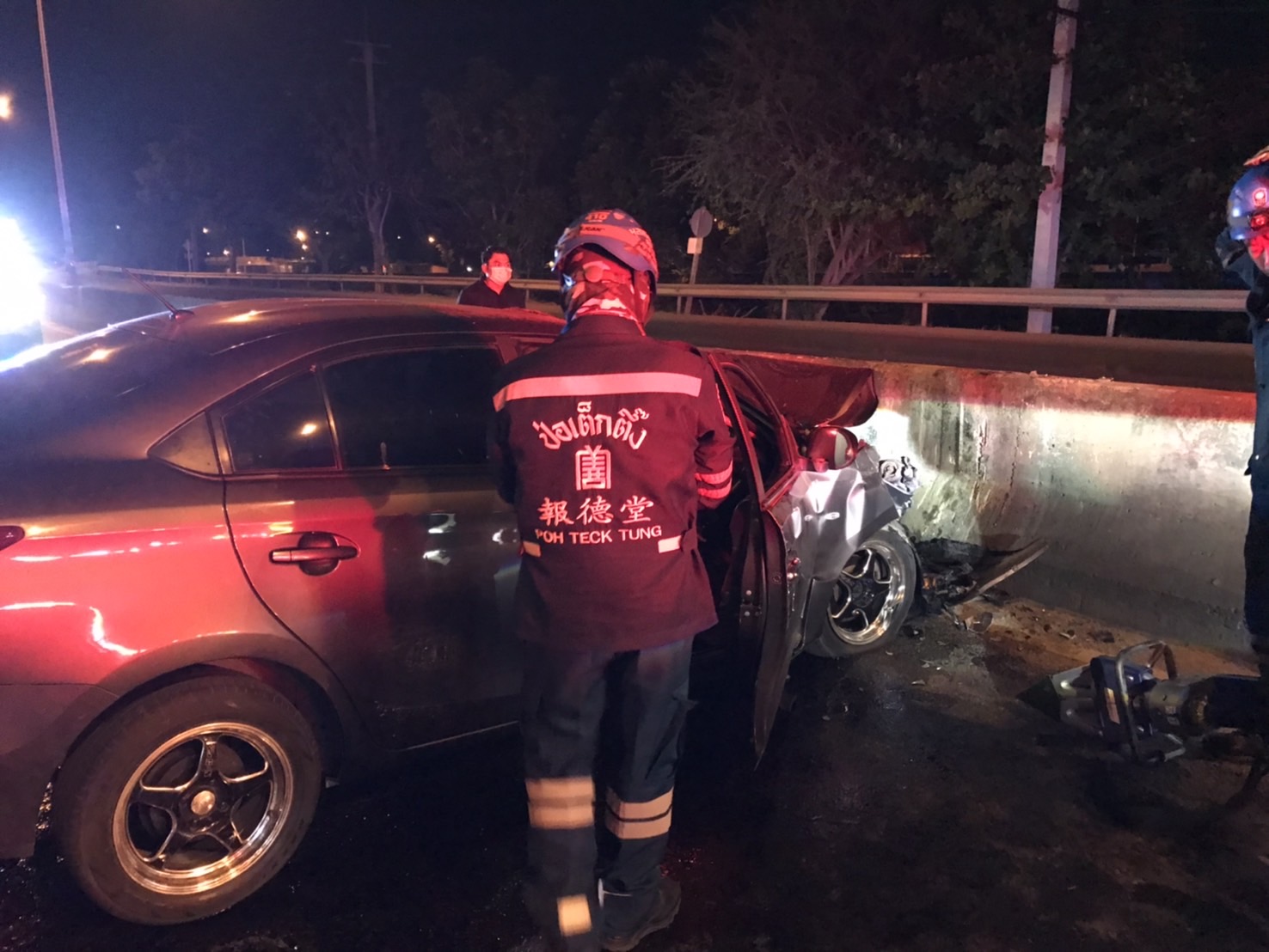 เก๋งเสียหลักชนแบริเออร์ รังสิต-นครนายก คลอง 6 คนขับเสียชีวิตติดในรถ