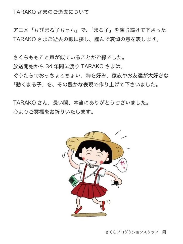 “ทาราโกะ ให้เสียงพากย์ มารุโกะ มาเป็นเวลา 34 ปีแล้ว นับตั้งแต่ตอนแรกของ จิบิ มารุโกะจัง เริ่มออกอากาศเมื่อวันที่ 7 มกราคม พ.ศ. 2533 ทางบริษัทขอขอบคุณและขอแสดงความเสียใจอย่างสุดซึ้ง ทาราโกะได้จากไปเมื่อวันที่ 4 มีนาคม 2024 เธอยังทำงานในขณะที่ต้องต่อสู้กับอาการป่วยมาตั้งแต่ต้นปีนี้ แต่อาการของเธอแย่ลงกะทันหัน” สำนักงาน Troubadour Musique ซึ่งเป็นต้นสังกัดระบุ