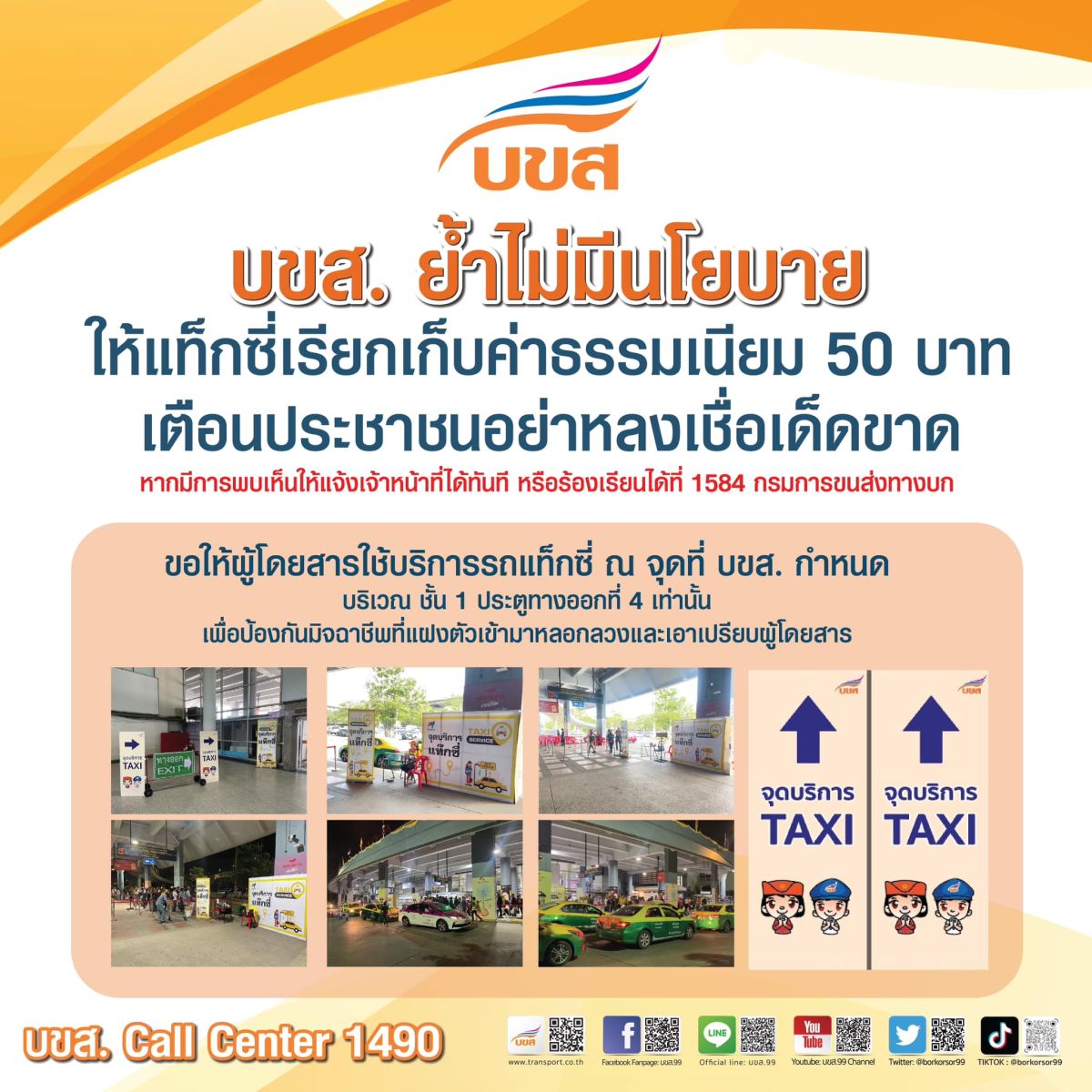 บขส. ยันไม่มีนโยบาย “ให้แท็กซี่เรียกเก็บค่าบริการ 50 บาท” ในสถานีขนส่ง หมอชิต 2 ย้ำหากพบเห็นพฤติกรรมดังกล่าวจะลงโทษตามกฎหมายทันที