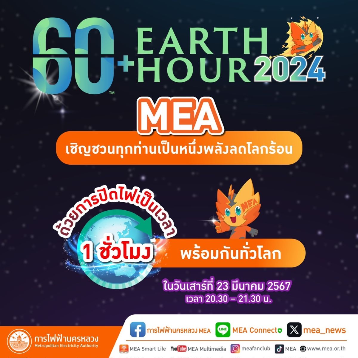 MEA เชิญชวนทุกท่านเป็นหนึ่งพลังลดโลกร้อน ด้วยการปิดไฟเป็นเวลา 1 ชั่วโมง พร้อมกันทั่วโลก