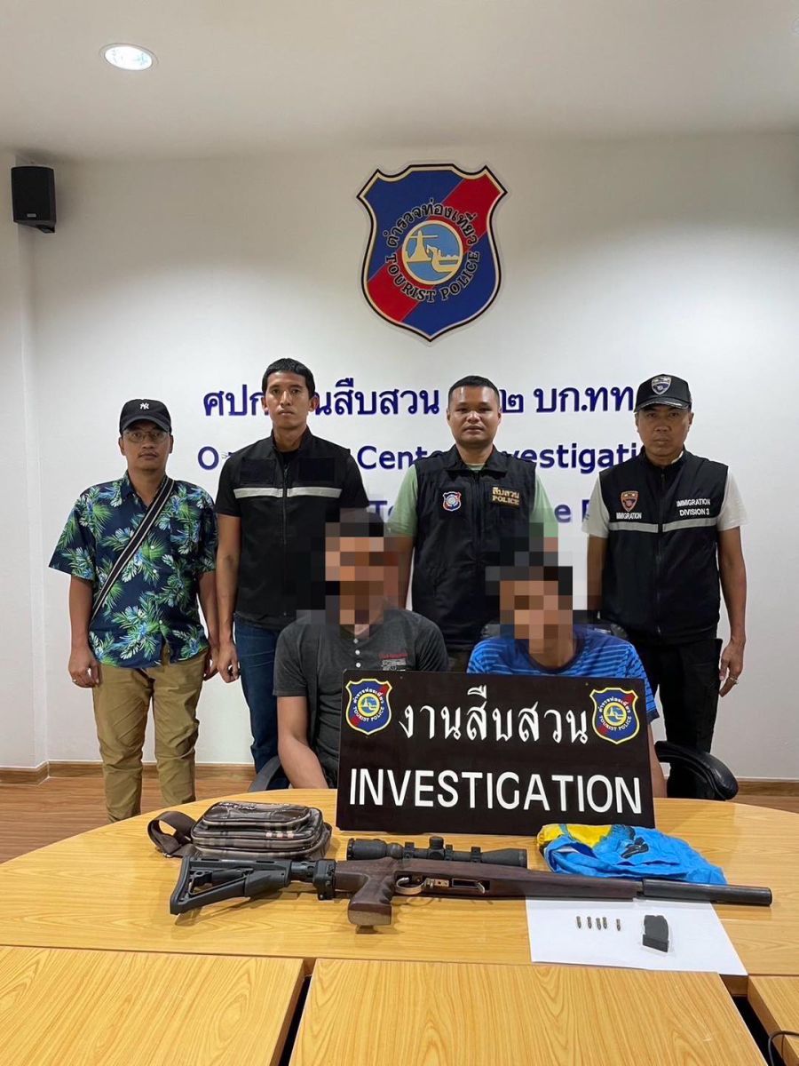 เมื่อเวลา 15.00 น.วันที่ 19 มีนาคม 2567 พล.ต.ต.มล.สันธิกร วรวรรณ ผบก.ทท.1, พ.ต.อ.ศราวุธ ตันกุล, พ.ต.อ.พัฒนา พัฒนชัย, พ.ต.อ.ปิยรัช สุภารัตน์ รอง ผบก.ทท.1, พ.ต.อ.แมน รถทอง ผกก.2 บก.ทท.1, พ.ต.ท.พิชญะ เขียวเปลื้อง, พ.ต.ท.สมควร แตงพรม รอง ผกก.2 บก.ทท.1 พ.ต.ต.กฤตพร แสงสุระ สว.กก.2 บก.ทท.1 พร้อมด้วยกำลังเจ้าหน้าที่ตำรวจสืบท่องเที่ยวเมืองพัทยา ร่วมกันจับกุม นาย ณ. (นามสมมุติ) อายุ 41 ปี และนาย พ. (นามสมมุติ) อายุ 26 ปี พร้อมของกลางเป็นอาวุธปืนยาวดัดแปลงขนาด .22 จำนวน 1 กระบอก พร้อมเครื่องกระสุน จำนวน 5 นัด สามารถ จับกุมได้ภายใน ซอยนาจอมเทียนสอง ต.นาจอมเทียน อ.สัตหีบ จ.ชลบุรี