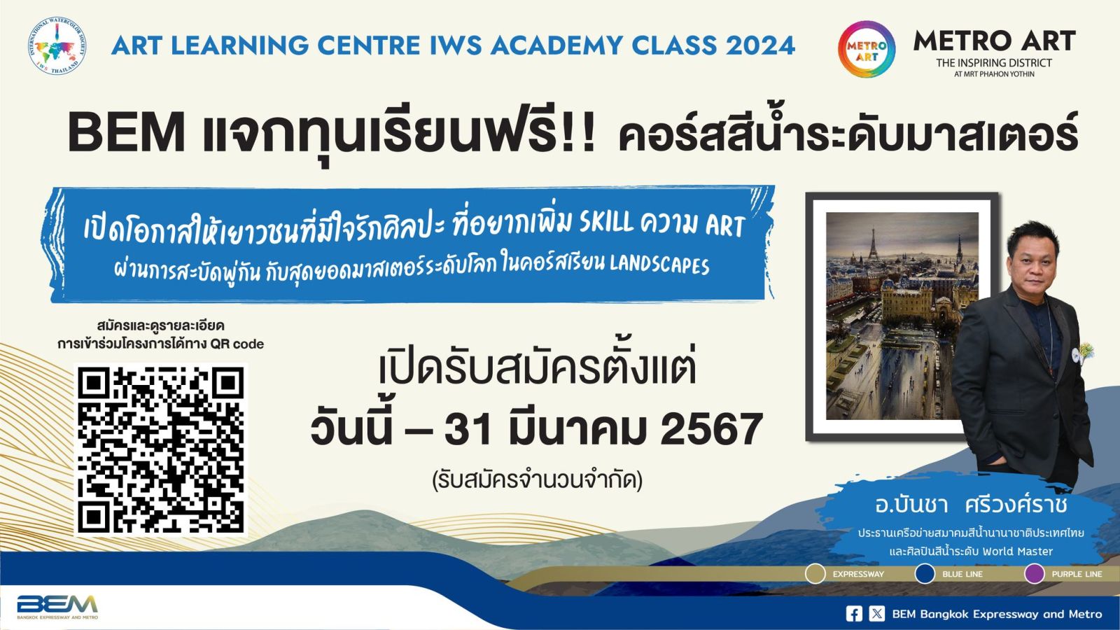 บริษัท ทางด่วนและรถไฟฟ้ากรุงเทพ จำกัด (มหาชน) หรือ BEM ร่วมกับ เครือข่ายสมาคมสีน้ำโลก IWS ประเทศไทย (International Watercolor Society) มอบโอกาสให้น้องๆ เยาวชนนักเรียนระดับชั้นมัธยมศึกษาปีที่ 1 – 6 ที่มีใจรักศิลปะ ต้องการเพิ่มทักษะฝีมือโดยไม่เสียค่าใช้จ่าย ทั้งยังได้สร้าง Portfolio สำหรับเข้าศึกษาต่อในระดับมหาวิทยาลัย ด้วยคอร์สเรียน “Basic Watercolor Landscapes การวาดภาพทิวทัศน์ สีน้ำขั้นพื้นฐาน”ศึกษาเทคนิคการวาดภาพสีน้ำตั้งแต่ระดับพื้นฐาน (Basic)จนถึงระดับแอดวานซ์ (Advanced) ด้วยความรู้แบบจัดเต็มจากศิลปินระดับมาสเตอร์ที่ได้รับการรับรองจาก IWS THAILAND พร้อมใบประกาศมาสเตอร์คลาส (Course Certificate)