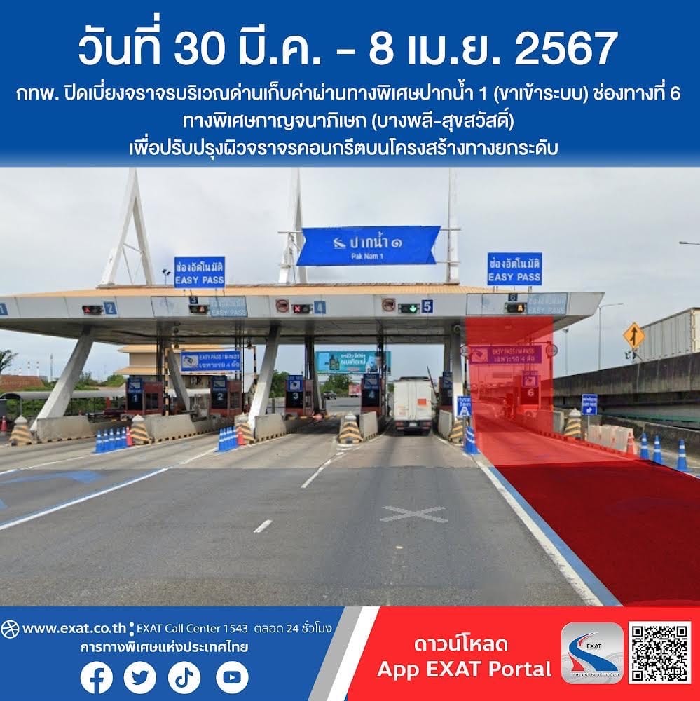 กทพ. ปิดเบี่ยงจราจรบริเวณด่านเก็บค่าผ่านทางพิเศษปากน้ำ 1 (ขาเข้าระบบ) ช่องทางที่ 6 ตั้งแต่วันที่ 30 มี.ค. 2567 เวลา 00.01 น. ถึง วันที่ 8 เม.ย. 2567 เวลา 24.00 น. เพื่อปรับปรุงผิวจราจร