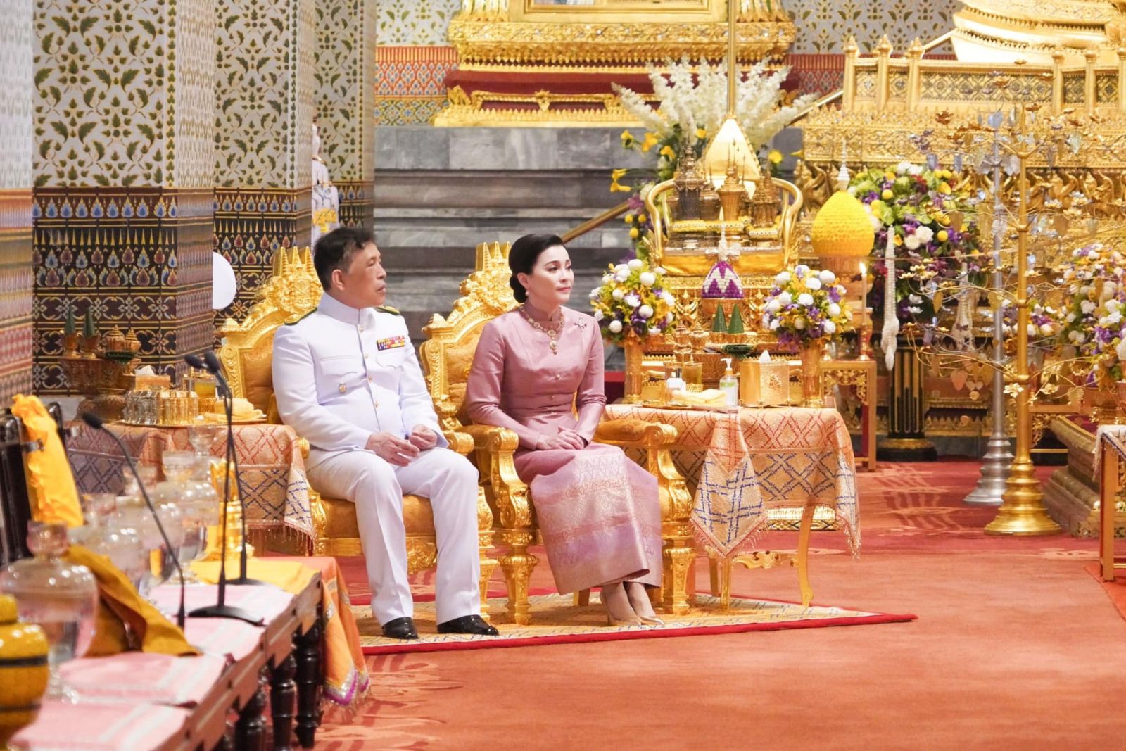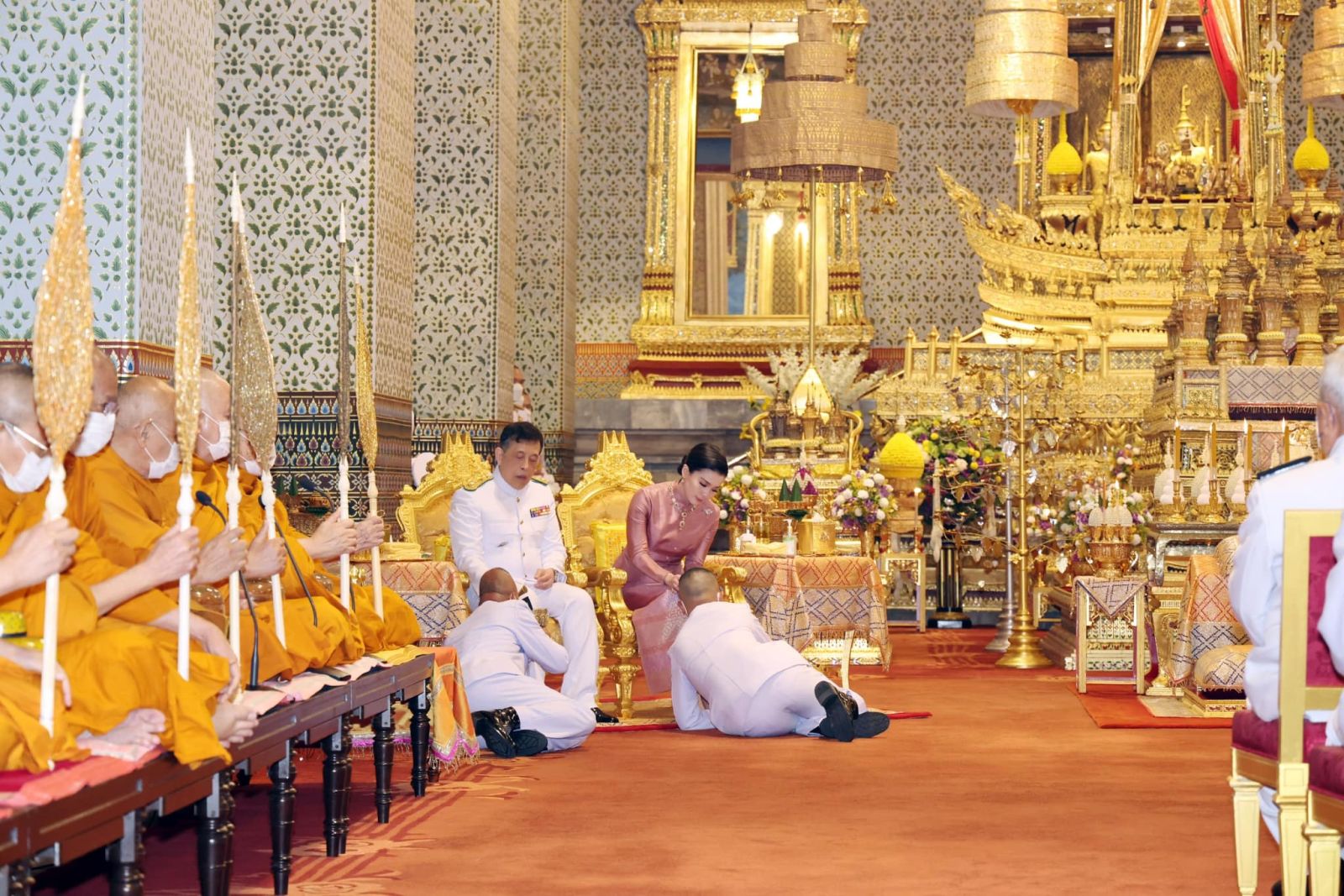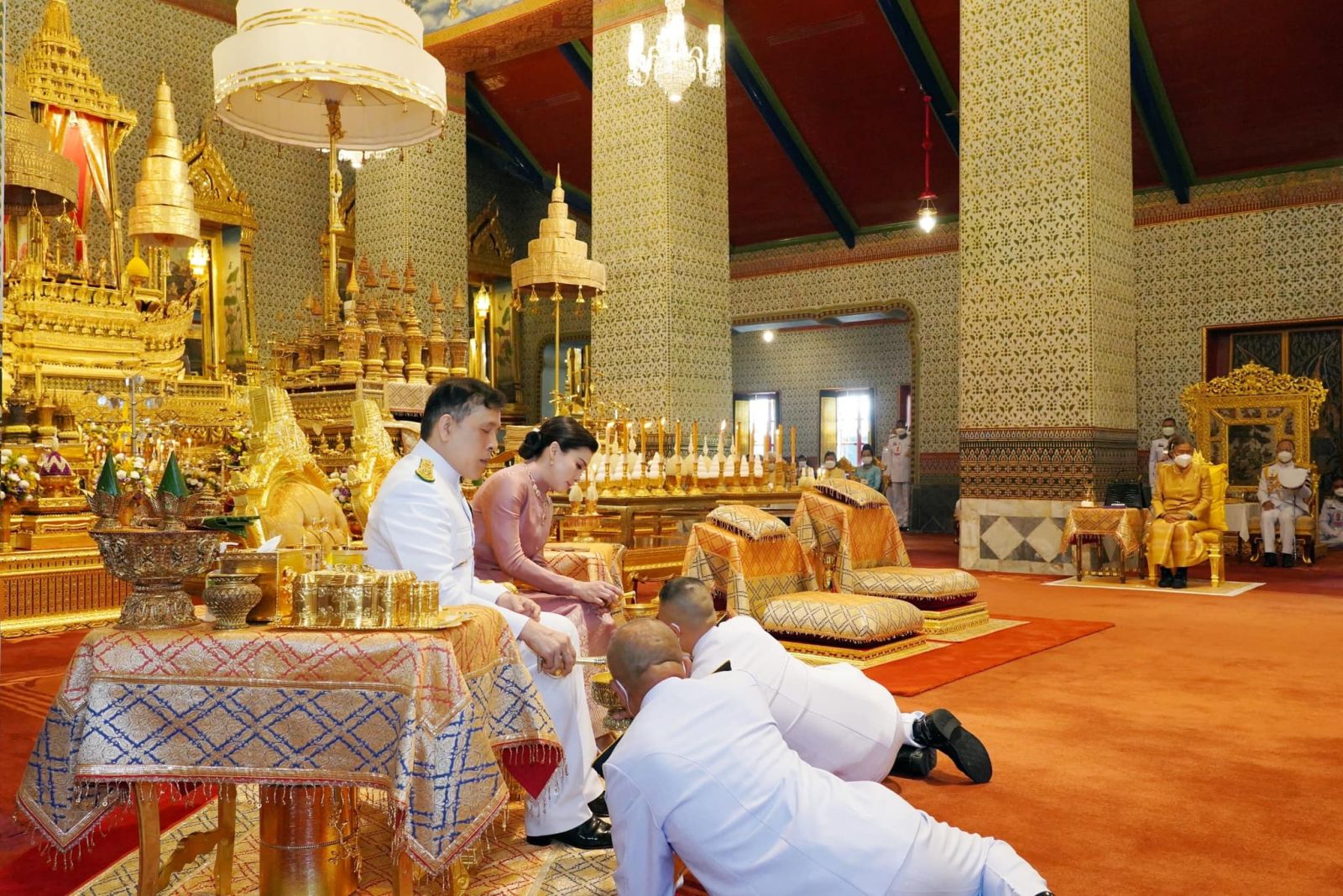 เมื่อเสด็จพระราชดำเนินถึงหอพระสุราลัยพิมาน พระบาทสมเด็จพระเจ้าอยู่หัว ทรงพระสุหร่าย สรงพระพุทธรูปสำคัญต่าง ๆ ทรงจุดธูปเทียนเครื่องนมัสการทองทิศ และทรงสรงพระบรมสารีริกธาตุ จากนั้น เสด็จพระราชดำเนินไปยังพระที่นั่งไพศาลทักษิณ ทรงจุดธูปเทียนเครื่องนมัสการท้ายที่นั่งบูชาพระสยามเทวาธิราช ทรงกราบ แล้วเสด็จพระราชดำเนินไปยังหอพระธาตุมณเฑียร ทรงจุดธูปเทียนเครื่องนมัสการทองทิศถวายราชสักการะ ทรงกราบถวายบังคมพระบรมอัฐิ และพระอัฐิ ทรงสรงน้ำพระบรมอัฐิ และพระอัฐิ ทั่วทุกพระโกศ ทรงกราบที่พระแท่นหน้าเครื่องราชสักการะ เสร็จแล้ว เสด็จพระราชดำเนินไปยังพระที่นั่งอมรินทรวินิจฉัย ทรงจุดธูปเทียนเครื่องนมัสการพานทองสองชั้นบูชาพระพุทธรูปประจำพระชนมวาร รัชกาลที่ ๑ - รัชกาลที่ ๙ ที่หน้าพระที่นั่งบุษบกมาลา ทรงกราบ พระสงฆ์ถวายศีลและถวายพรพระ จบแล้ว เสด็จพระราชดำเนินไปทรงจุดธูปเทียนที่พนมข้าวบิณฑ์หน้าพระที่นั่งบุษบกมาลา แล้วเสด็จพระราชดำเนินไปทรงประเคนปิ่นโตภัตตาหารแด่ประธานสงฆ์ ปิ่นโตภัตตาหารนอกนั้น ทรงพระกรุณาโปรดเกล้าโปรดกระหม่อมให้พระราชวงศ์ องคมนตรี และข้าราชการชั้นผู้ใหญ่ ทรงประเคน และประเคนพระสงฆ์รูปต่อไปตามลำดับ เสร็จแล้ว เจ้าพนักงานเชิญพระโกศพระบรมอัฐิ และพระโกศพระอัฐิ ออกประดิษฐานบนพระราชบัลลังก์ภายใต้พระนพปฎลมหาเศวตฉัตร และบนพระที่นั่งกง พระสงฆ์สดับปกรณ์ พระบาทสมเด็จพระเจ้าอยู่หัว ทรงจุดธูปเทียนเครื่องราชสักการะทองลงยาราชาวดี และทรงจุดธูปเทียนเครื่องทองน้อยที่หน้าพระแท่นพระนพปฎลมหาเศวตฉัตร ทรงกราบ ถวายบังคมพระบรมอัฐิ และพระอัฐิ สมเด็จพระนางเจ้า ฯ พระบรมราชินี ทรงจุดธูปเทียนเครื่องราชสักการะทองลงยารอง และทรงจุดธูปเทียนเครื่องทองน้อยที่หน้าพระแท่นพระนพปฎลมหาเศวตฉัตร ทรงกราบถวายบังคมพระบรมอัฐิ และพระอัฐิ แล้วเสด็จพระราชดำเนินไปทรงทอดผ้าคู่ถวายพระสงฆ์ จำนวน ๔ เที่ยว เที่ยวละ ๑๘ รูป พระสงฆ์สดับปกรณ์ ทรงหลั่งทักษิโณทก พระสงฆ์ถวายอนุโมทนา ถวายอดิเรก ถวายพระพรลา จากนั้น เสด็จพระราชดำเนินไปทรงกราบพระพุทธรูปประจำพระชนมวาร รัชกาลที่ ๑ – รัชกาลที่ ๙ ที่หน้าพระที่นั่งบุษบกมาลา ทรงกราบพระบรมอัฐิ และพระอัฐิที่หน้าพระแท่นพระนพปฎลมหาเศวตฉัตร ทรงรับการถวายความเคารพของผู้มาเฝ้าทูลละอองธุลีพระบาท แล้วเสด็จออกจากพระที่นั่งอมรินทรวินิจฉัย ประทับรถยนต์พระที่นั่ง เสด็จพระราชดำเนินกลับ