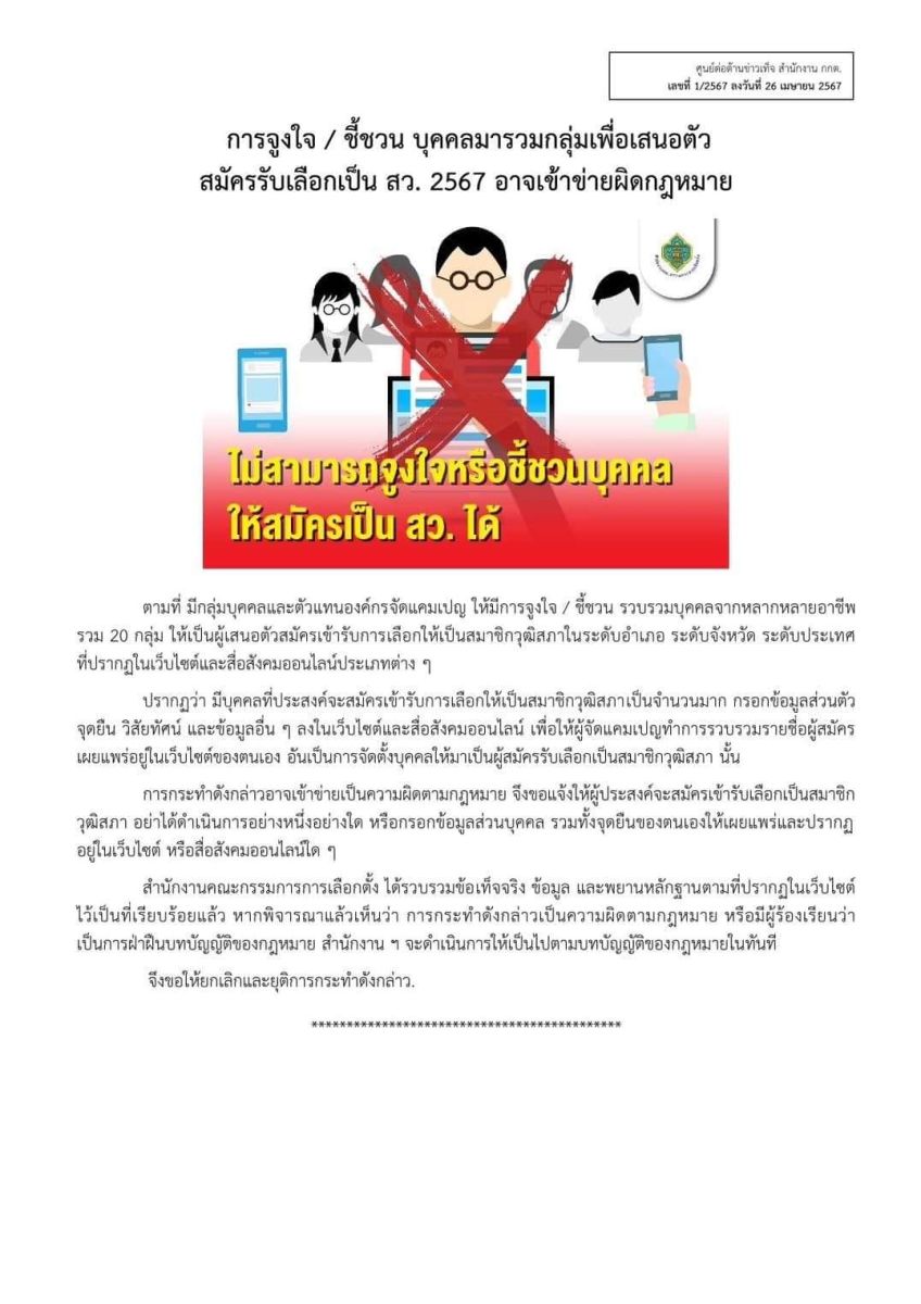 การกระทำดังกล่าวอาจเข้าข่ายเป็นความผิดตามกฎหมาย จึงขอแจ้งให้ผู้ประสงค์จะสมัครเข้ารับเลือกเป็นสมาชิกวุฒิสภา อย่าได้ดำเนินการอย่างหนึ่งอย่างใด หรือกรอกข้อมูลส่วนบุคคล รวมทั้งจุดยืนของตนเองให้เผยแพร่และปรากฏอยู่ในเว็บไซต์ หรือสื่อสังคมออนไลน์ใด ๆ