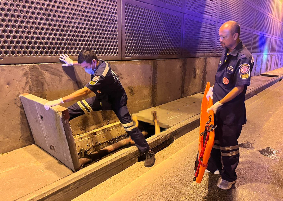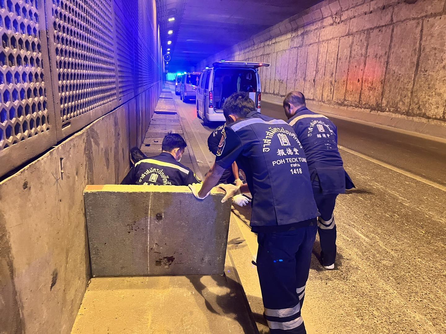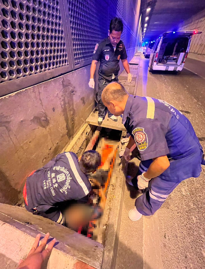 ที่เกิดเหตุเป็นรถ จยย. เสียหลักพลิกคว่ำ มีผู้ได้รับบาดเจ็บเป็นชาย 1 ราย อยู่ในท่อระบายน้ำขอบอุโมงค์ มีความลึกประมาณ 50 ซม
