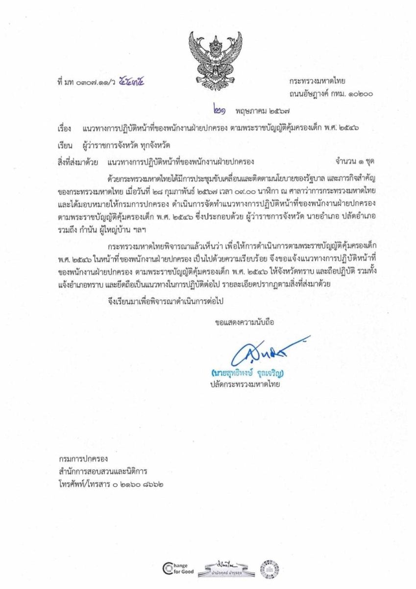 วันที่ 23 พฤษภาคม 2567 นายสุทธิพงษ์ จุลเจริญ ปลัดกระทรวงมหาดไทย กล่าวว่า ปัจจุบันประเทศไทยมีการบังคับใช้กฎหมายว่าด้วยการคุ้มครองเด็ก คือ "พระราชบัญญัติคุ้มครองเด็ก พ.ศ. 2546" จึงมีหนังสือให้ผู้ว่าฯ กำชับพนักงานฝ่ายปกครอง ซักซ้อม ทบทวน ทำความเข้าใจ และปฏิบัติตามหน้าที่อย่างเคร่งครัด โดยเฉพาะอย่างยิ่ง การช่วยเหลือดูแลและให้ความคุ้มครองเด็ก เยาวชน ผู้ ให้มีชีวิตความเป็นอยู่ที่ดี ได้รับการศึกษาและการเลี้ยงดูอย่างเหมาะสม มีความมั่นคงทางอาหาร