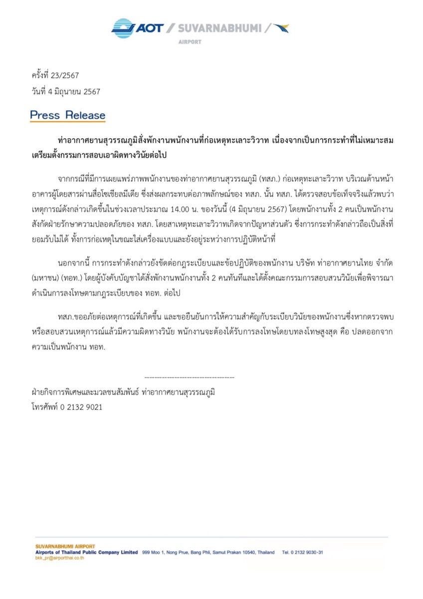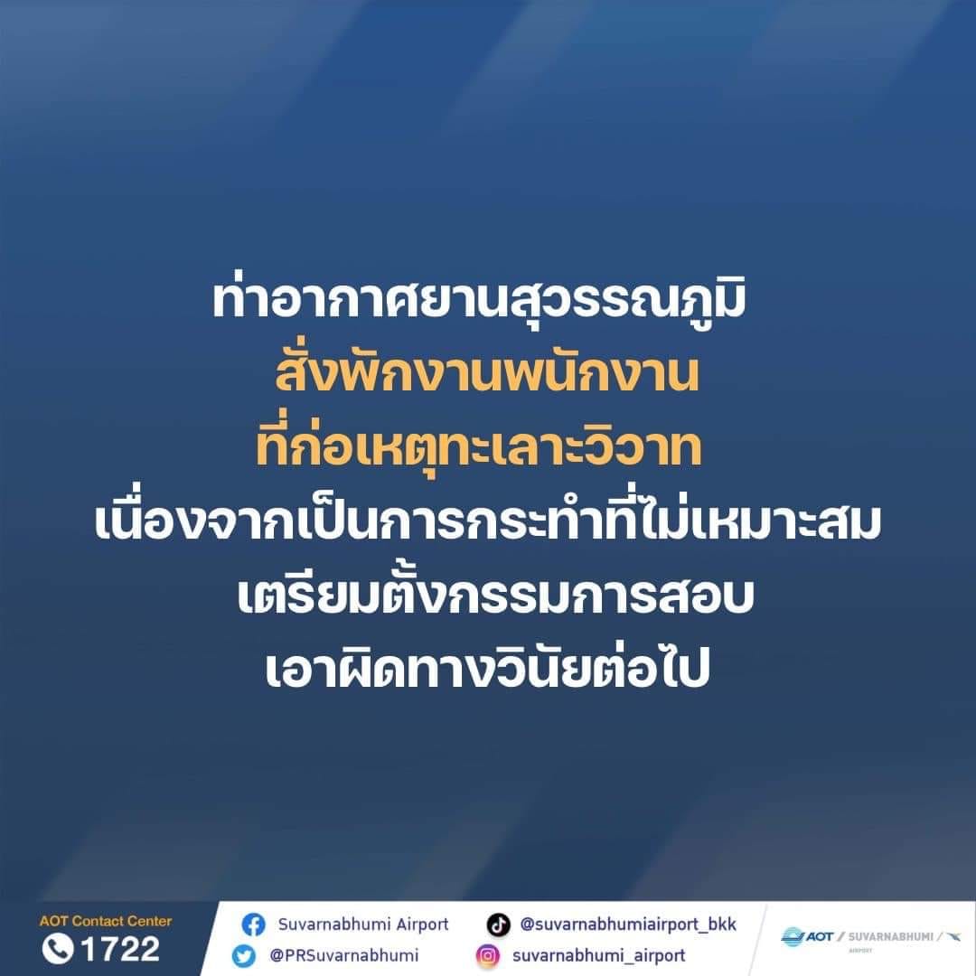 โดยท่าอากาศยานสุวรรณภูมิ (Suvarnabhumi Airport) ชี้แจง รายละเอียดระบุ จากกรณีที่มีการเผยแพร่ภาพพนักงานของท่าอากาศยานสุวรรณภูมิ (ทสภ.) ก่อเหตุทะเลาะวิวาท บริเวณด้านหน้าอาคารผู้โดยสารผ่านสื่อโซเชียลมีเดีย ซึ่งส่งผลกระทบต่อภาพลักษณ์ของ ทสภ. นั้น