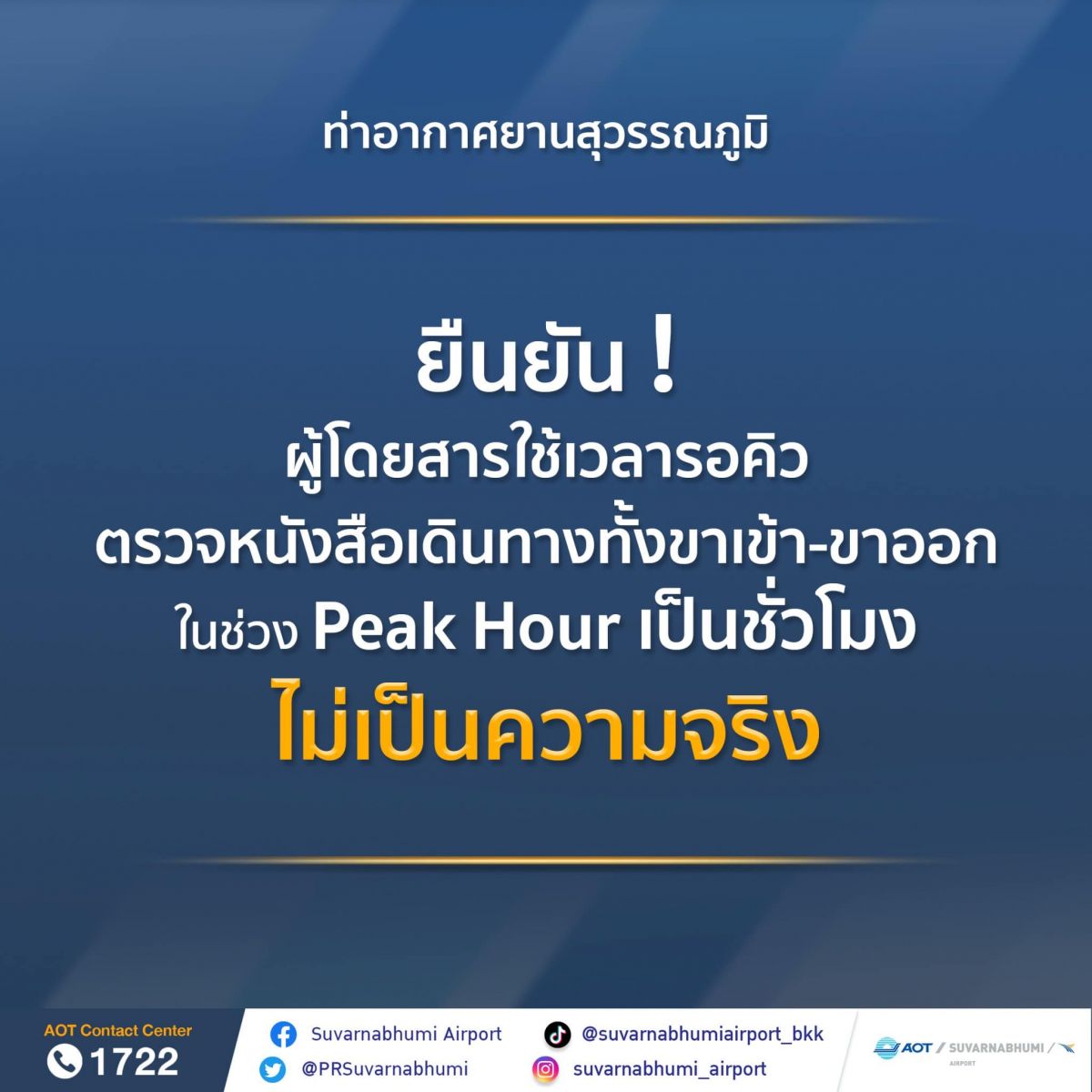 ท่าอากาศยานสุวรรณภูมิ (ทสภ.) ยืนยัน “ผู้โดยสารใช้เวลารอคิวตรวจหนังสือเดินทางทั้งขาเข้า - ขาออกในช่วง Peak Hour เป็นชั่วโมง” ไม่เป็นความจริง