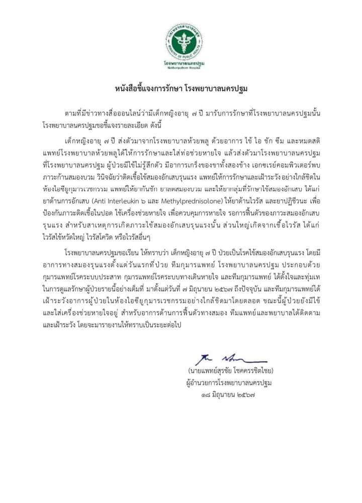 โรงพยาบาลนครปฐมขอเรียน ให้ทราบว่า เด็กหญิงอายุ 7 ปี ป่วยเป็นโรคไข้สมองอักเสบรุนแรง โดยมีอาการทางสมองรุนแรงตั้งแต่วันแรกที่ป่วย ทีมกุมารแพทย์ โรงพยาบาลนครปฐม ประกอบด้วย กุมารแพทย์โรคระบบประสาท กุมารแพทย์โรคระบบทางเดินหายใจ และทีมกุมารแพทย์ ได้ตั้งใจและทุ่มเท ในการดูแลรักษาผู้ป่วยรายนี้อย่างเต็มที่ มาตั้งแต่วันที่ 7 มิถุนายน 2567 ถึงปัจจุบัน และทีมกุมารแพทย์ได้ เฝ้าระวังอาการผู้ป่วยในห้องไอซียูกุมารเวชกรรมอย่างใกล้ชิดมาโดยตลอด