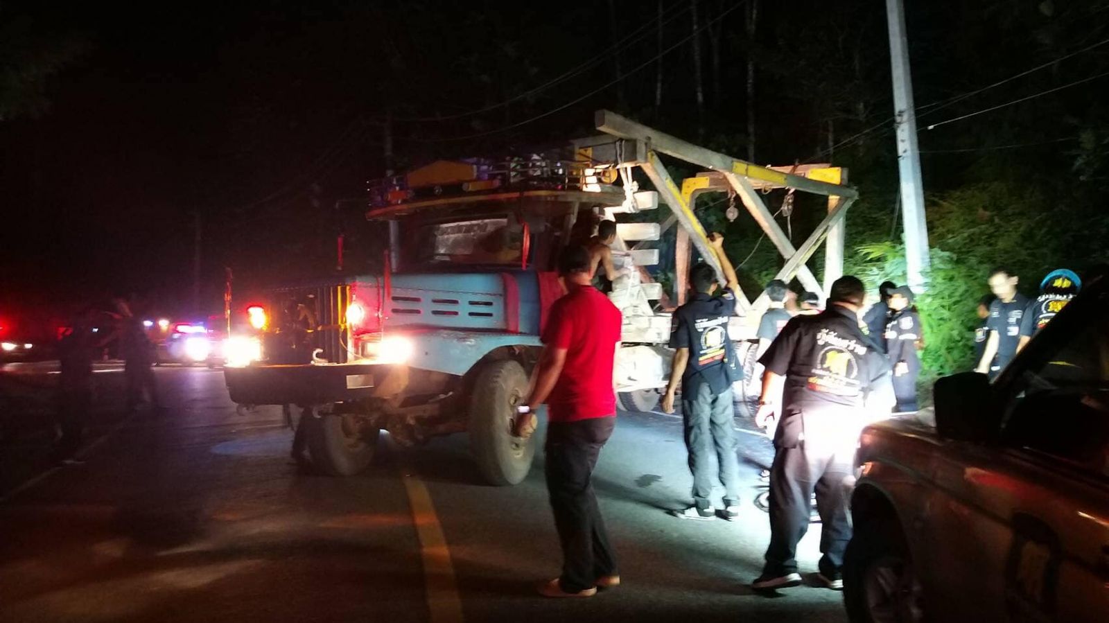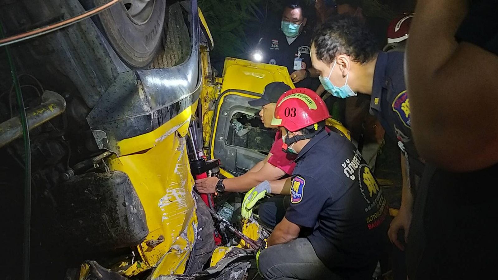 โดยที่เกิดเหตุ พบเป็นรถเทรลเลอร์ สีเหลือง ด้านหลังบรรทุกรถแบ็คโฮ ลักษณะพลิกตกข้างทาง ภายในหัวรถพบร่างคนขับชาย และร่างเด็กผู้ชาย ติดอยู่ในรถ ตรวจสอบเบื้องต้นพบว่าเสียชีวิตแล้วทััง 2 ราย ต้องใช้เครื่องตัดถ่างนำร่างออกมา แต่เนื่องจากรถเทเลอร์น้ำหนักมาก จึงขอสนับสนุนรถยก ขึ้นเพื่อนำผู้เสียชีวิตทั้ง 2 รายออกมาจากหัวรถใช้เวลาประมาณ 2 ชั่วโมง