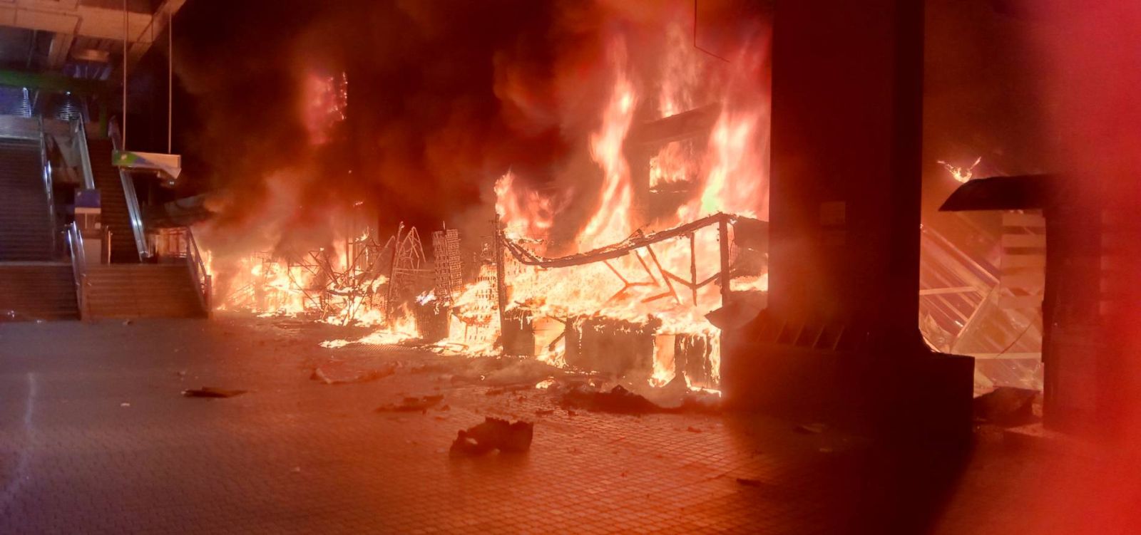 ไฟไหม้โซนเต็นท์ขายของ ใกล้สถานีรถไฟฟ้าฯ ย่านรามคำแหง เสียหายวอดหลายร้าน ผู้ว่าฯ กทม. รุดตรวจสอบที่เกิดเหตุ