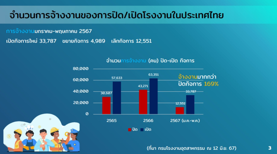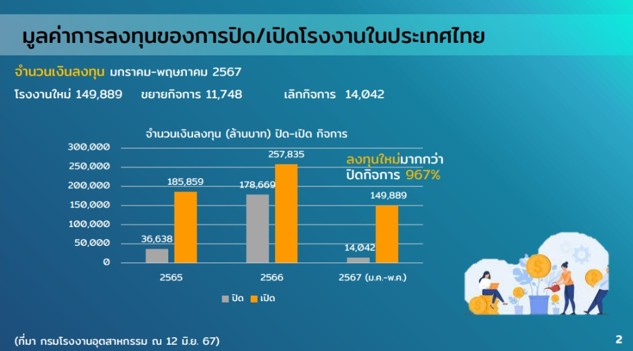 โฆษกประจำสำนักนายกรัฐมนตรีกล่าวเพิ่มเติมว่า ในช่วงระยะเวลา ตั้งแต่มกราคม-พฤษภาคม 2567 มีมูลค่าการลงทุนของการเปิดโรงงานใหม่ในประเทศไทยถึง 149,889 ล้านบาท ส่วนโรงงานเดิมที่มีการขยายกิจการมีการลงทุนเพิ่มขึ้น 11,748 ล้านบาท ในขณะที่การปิดกิจการคิดเป็นมูลค่า 14,042 ล้านบาท ซึ่งสะท้อนให้เห็นว่ามีเงินลงทุนมากกว่าปิดกิจการกว่า 10 เท่า นอกจากนี้ ในด้านการจ้างงานในภาคอุตสาหกรรม การเปิดโรงงานใหม่มีการจ้างงานถึง 33,787 คน ส่วนการปิดกิจการมีการเลิกจ้างงาน 12,551 คน แสดงให้เห็นว่าการจ้างงานมีมากกว่าการเลิกจ้างงานจากการปิดกิจการคิดเป็น 169%