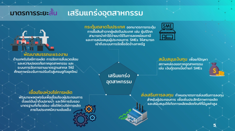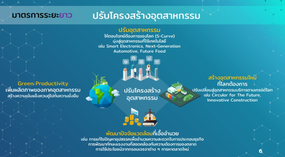 นอกจากนี้ รัฐบาลนายเศรษฐา ทวีสิน นายกรัฐมนตรี ได้วางนโยบายเพื่อส่งเสริมความแข็งแกร่งให้กับอุตสาหกรรม ทั้งในระยะสั้น และระยะยาว โดยในระยะสั้น ได้แก่ การกระตุ้นตลาดในประเทศ ออกมาตรการกระตุ้นการซื้อสินค้าจากผู้ผลิตในประเทศ พัฒนาสมรรถนะแรงงานด้านเทคโนโลยีการผลิตในประเทศ สนับสนุนเงินทุนเพื่อแก้ปัญหาสภาพคล่อง เชื่อมโยงห่วงโซ่การผลิต และส่งเสริมการลงทุน รวมทั้งมาตรการระยะยาว ได้แก่ มุ่งปรับอุตสาหกรรมให้ตอบโจทย์ต้องการของโลก พัฒนาปัจจัยแวดล้อมที่เอื้ออำนวยความสะดวกในการประกอบธุรกิจ สร้างอุตสาหกรรมใหม่ที่โลกต้องการ และส่งเสริม Green Productivity เพิ่มผลิตภาพของภาคอุตสาหกรรม สร้างความเข้มแข็งควบคู่ไปกับความยั่งยืน