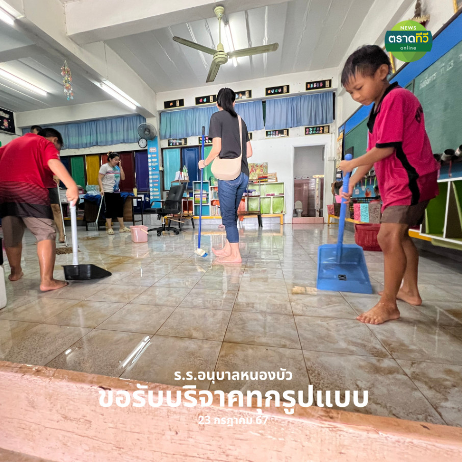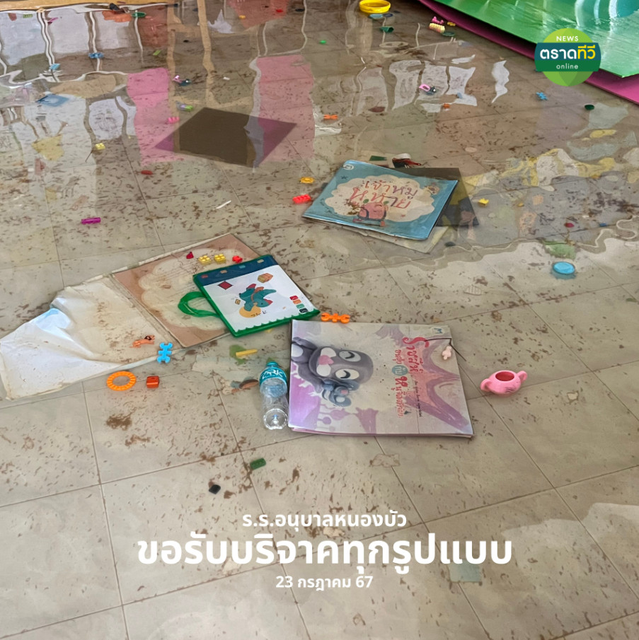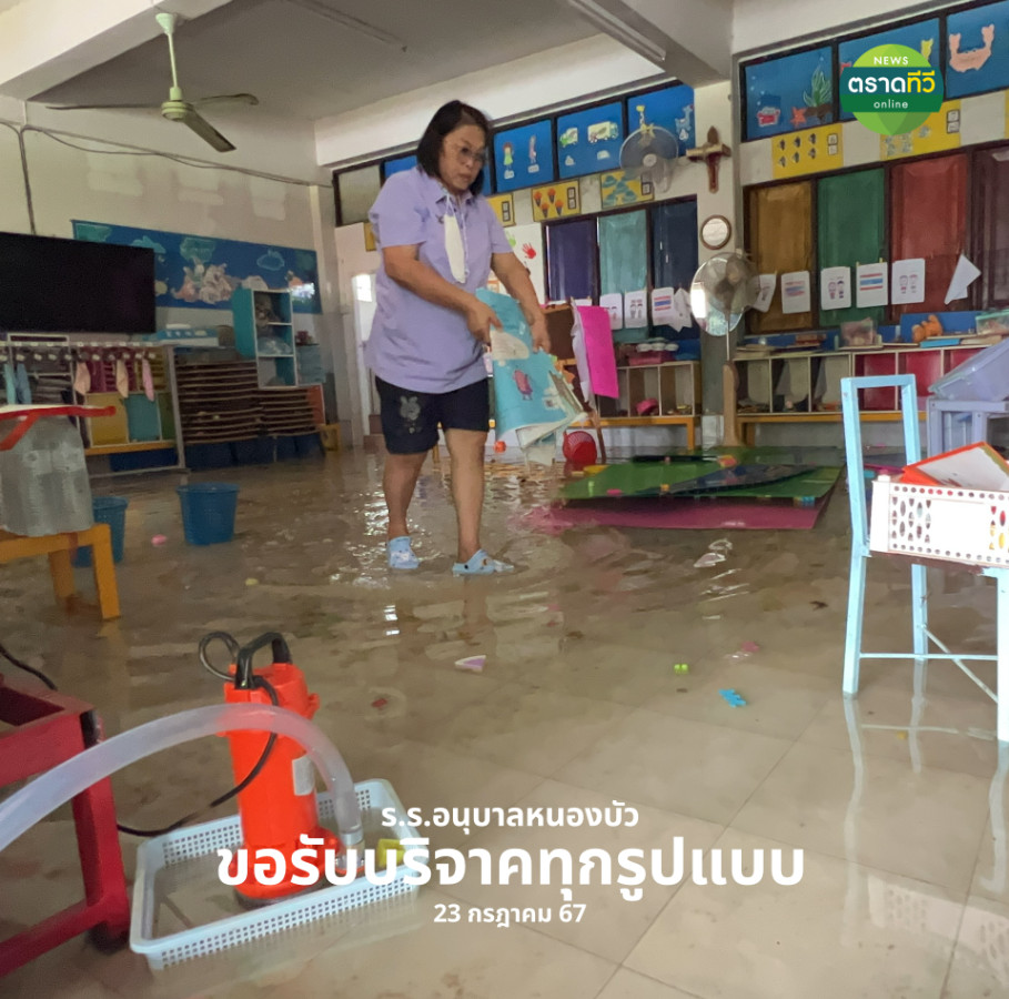 ที่โรงเรียนอนุบาลชุมชนวัดหนองบัว ต.วังกระแจะ อ.เมือง จ.ตราด นางเกสร สกุลเมือง ผู้อำนวยการโรงเรียนอนุบาลชุมชนวัดหนองบัว พร้อมครูจำนวน 12 คน และนักเรียน 3-5 คน เข้าเก็บสิ่งของและทำความสะอาดพื้นห้องนักเรียนชั้นอนุบาล 2 ชั้นอนุบาล 3 ชั้นประถมศึกษาปีที่ 1 ห้องดิจิตอลชุมชน(คอมพิวเตอร์) เรือนดนตรี และโรงอาหาร หลังจากเกิดน้ำท่วมฉับพลัน เมื่อวันที่ 21 กรกฎาคม 2567 ไหลเข้าท่วมทุกพื้นที่ของโรงเรียนสูง 1 เมตร เป็นการท่วมครั้งใหญ่ในรอบ 50 ปี เบื้องต้น ได้แยกสิ่งของที่ยังได้ใช้ นำออกมาตากแดดและแยกเอาไว้ เพื่อนำกลับมาใช้ใหม่ ส่วนชิ้นไหนที่เสียหายได้กองรวมและเตรียมนำไปทิ้ง