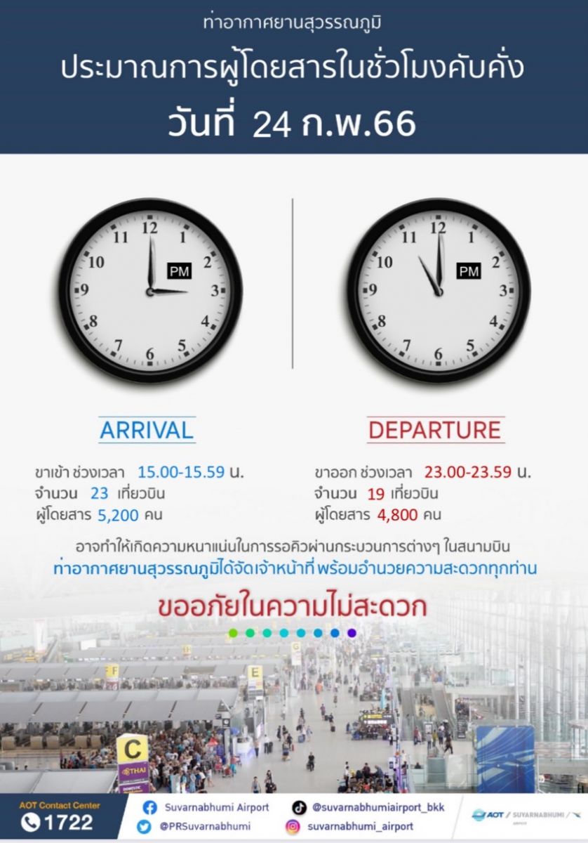 ท่าอากาศยานสุวรรณภูมิ (ทสภ.) ประมาณการผู้โดยสารเที่ยวบินระหว่างประเทศในชั่วโมงคับคั่ง (Peak Hours) ในวันที่ 24 ก.พ.66 ซึ่งอาจทำให้เกิดความหนาแน่นในการรอคิวผ่านกระบวนการต่างๆ อย่างไรก็ตาม ทสภ.ได้จัดเจ้าหน้าที่สนามบิน และเจ้าหน้าที่ Airport Ambassador คอยช่วยเหลือพร้อมอำนวยความสะดวกผู้โดยสารทุกท่าน