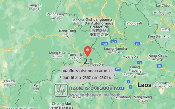 เวลา 22.01 น. วันที่ 16 สิงหาคม 2567 กองเฝ้าระวังแผ่นดินไหว กรมอุตุนิยมวิทยา แจ้งเหตุแผ่นดินไหว ขนาด 2.1 ความลึก 1 กม. ภายในพื้นที่ของประเทศลาว (20.56°N,100.38°E)
