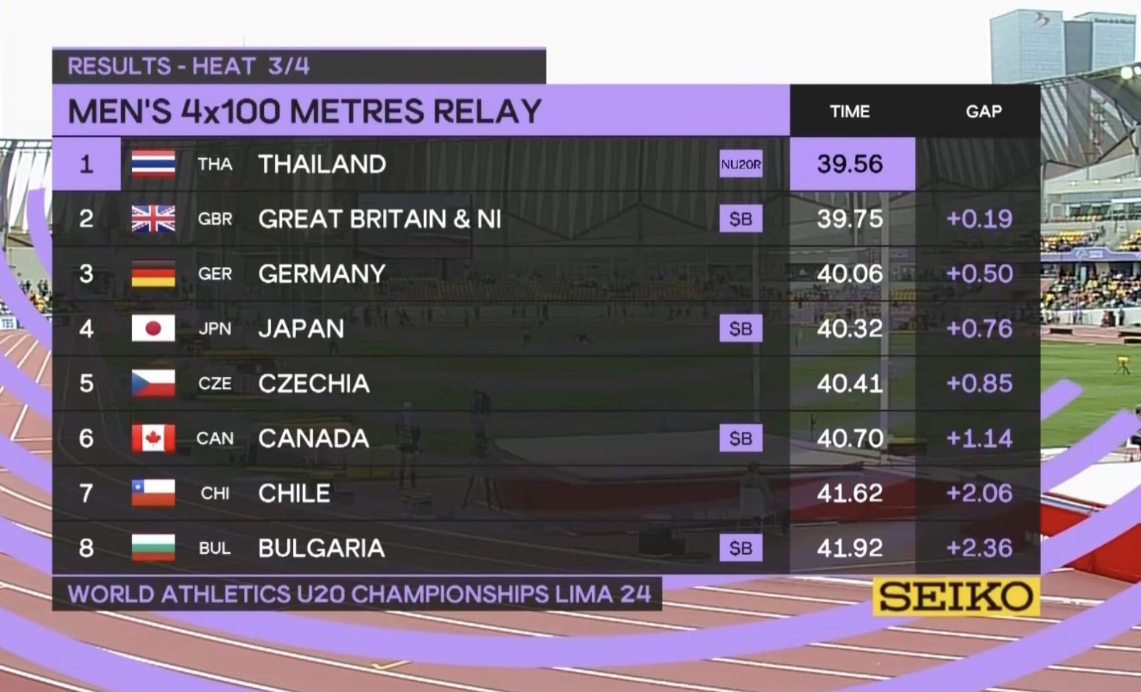 31 สิงหาคม 2567 เวลา 01.25 น. เพจ สมาคมกีฬากรีฑาแห่งประเทศไทย ในพระบรมราชูปถัมภ์ รายงาน การแข่งขัน 4 x 100 เมตร ชายกรีฑาเยาวชนโลก WORLD ATHLETICS U20 CHAMPIONSHIP LIMA PERU ณ กรุงลิมา ประเทศเปรู ทีมชาติไทย โดยอยู่ในฮีทที่ 3 ลู่วิ่งที่ 8 นำทีมโดย