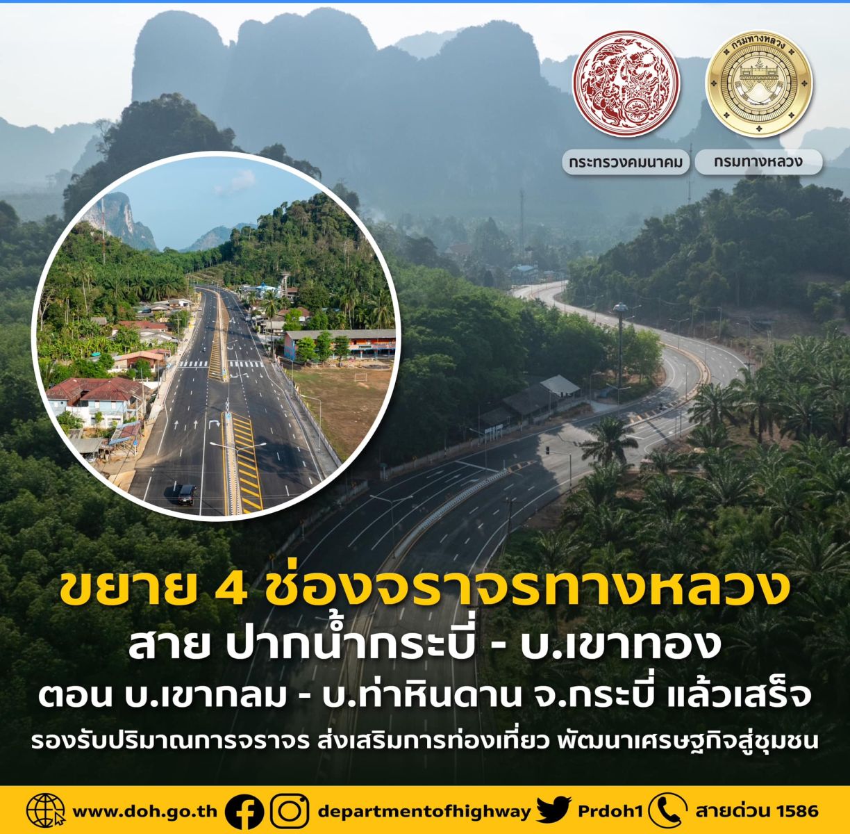กรมทางหลวงก่อสร้างขยายทางหลวงหมายเลข 4034 สายปากน้ำกระบี่ - บ. เขาทอง ตอน บ.เขากลม - บ.ท่าหิน-ดาน จ.กระบี่ แล้วเสร็จ พัฒนาโครงสร้างพื้นฐานทางถนนเพื่อสนับสนุนการท่องเที่ยวสู่ฝั่งอันดามัน