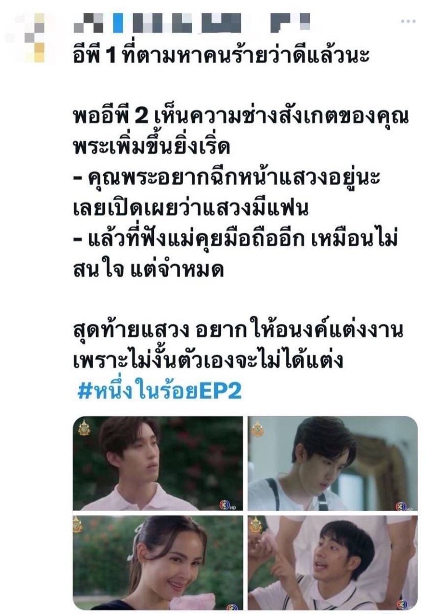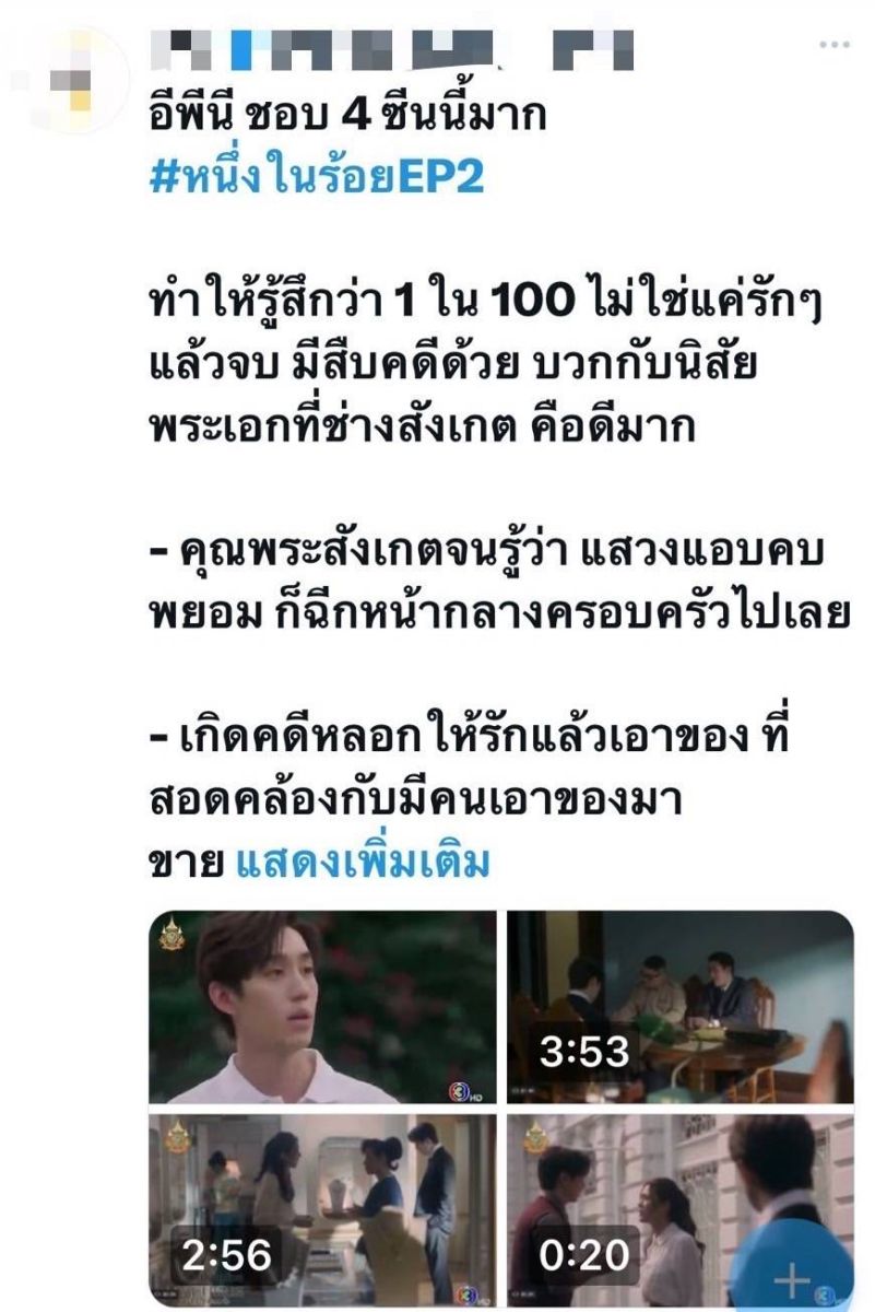 เป็นครั้งแรกของการทำละครวินเทจคลาสสิกรักโรแมนติกที่สวยสมการรอคอยของผู้จัดคนเก่ง “แอน ทองประสม” แห่งค่าย ทอง เอ็นเตอร์เทนเม้นท์ จำกัด งานละเอียด เกรดพรีเมี่ยมมาก ๆ กับละครเรื่อง “หนึ่งในร้อย” ผลงานกำกับของ “แอ้ว-อำไพพร จิตต์ไม่งง” ที่หลายคนต้องปรบมือให้กับการจับคู่เคมีใหม่ที่มาแรงสุด ๆ สำหรับ พระ-นางตัวท็อป อย่าง สาว “ญาญ่า อุรัสยา” ประกบคู่กับพระเอก “ต่อ ธนภพ” ร่วมด้วย มีน พีรวิชญ์, หลิงหลิง คอง พร้อมทัพนักแสดงอีกเพียบ ที่มาร่วมถ่ายทอดความสนุกจนมาถึง อีพี 2-3 ก็ยังคงกระแสแรงไม่แผ่วทำแฮชแท็ก #หนึ่งในร้อยEP2-3 พุ่งติดเทรนด์ X อีกครั้ง