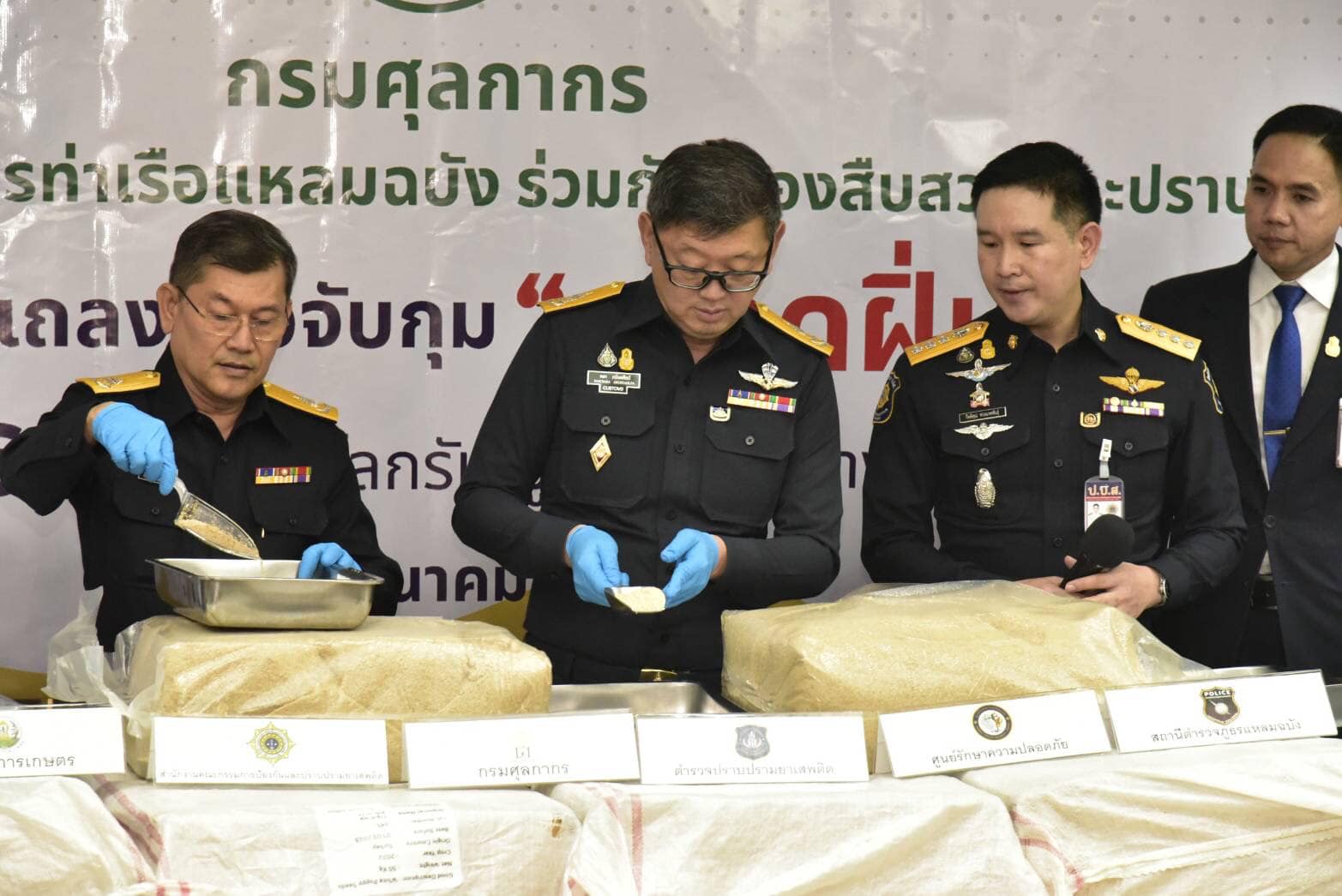 (1 มีนาคม 2566) นายพชร อนันตศิลป์ อธิบดีกรมศุลกากร นายพงศ์เทพ บัวทรัพย์ รองอธิบดี รักษาการในตำแหน่งที่ปรึกษาด้านพัฒนาระบบควบคุมทางศุลกากร นางนันท์ฐิตา ศิริคุปต์ รองอธิบดีกรมศุลกากร พ.ต.ท.กิตติคุณ พ่วงนาคพันธุ์ ผู้อำนวยการส่วนปฏิบัติการข่าวและปราบปรามยาเสพติด 6 สำนักงานคณะกรรมการป้องกันและปราบปรามยาเสพติด (ป.ป.ส.) พ.อ.มารุต เปล่งขำ ผู้อำนวยการ กอง 12 ศูนย์รักษาความปลอดภัย กองบัญชาการกองทัพไทย นางสาววิลาสินี พุ่มสงวน เภสัชกรชำนาญการ สำนักงานคณะกรรมการอาหารและยา ร่วมกันแถลงข่าวการยึด “เมล็ดฝิ่น” ลักลอบนำเข้าจากต่างประเทศ ทางท่าเรือแหลมฉบัง น้ำหนัก 26,000 กิโลกรัม มูลค่า 30 ล้านบาท ณ ศูนย์แถลงข่าว ชั้น 2 กรมศุลกากร คลองเตย