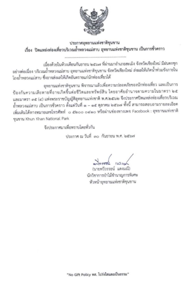 30 กันยายน 2567 อุทยานแห่งชาติขุนขาน จังหวัดเชียงใหม่ ประกาศปิดการท่องเที่ยวบริเวณถ้ำหลวงแม่สาบเป็นการชั่วคราว ตั้งแต่วันที่ 1-15 ตุลาคม 2567 เนื่องจากสภาพอากาศที่แปรปรวนและฝนตกหนักในช่วงเดือนกันยายนที่ผ่านมา