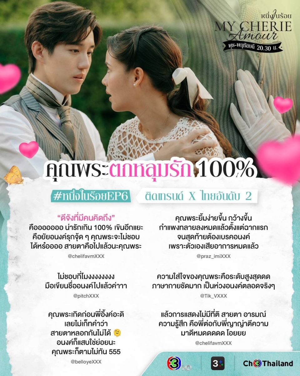 กระแสแรงเกินต้านจริง ๆ สำหรับละครวินเทจ เป๊ะ ปัง อลังเวอร์ “หนึ่งในร้อย” ทางช่อง 3 ผลงานจากค่าย ทองเอ็นเตอร์เทนเม้นต์ ของผู้จัดตัวแม่ “แอน ทองประสม” และผู้กำกับคู่ใจ “แอ้ว-อำไพพร จิตต์ไม่งง” กับเคมีกลมกล่อม ครบรส ของคู่พระนางอย่าง “ต่อ-ญาญ่า” ที่ดูละมุนจิตละมุนใจ จนพาแฮชแท็ก #หนึ่งในร้อยEP6 กวาดกระแสความนิยมบนโลกออนไลน์จนติดเทรนด์ X ของประเทศไทย พร้อมคำชมสุดปัง สมเป็นละครโรแมนติกฟีลกู้ดแห่งปี