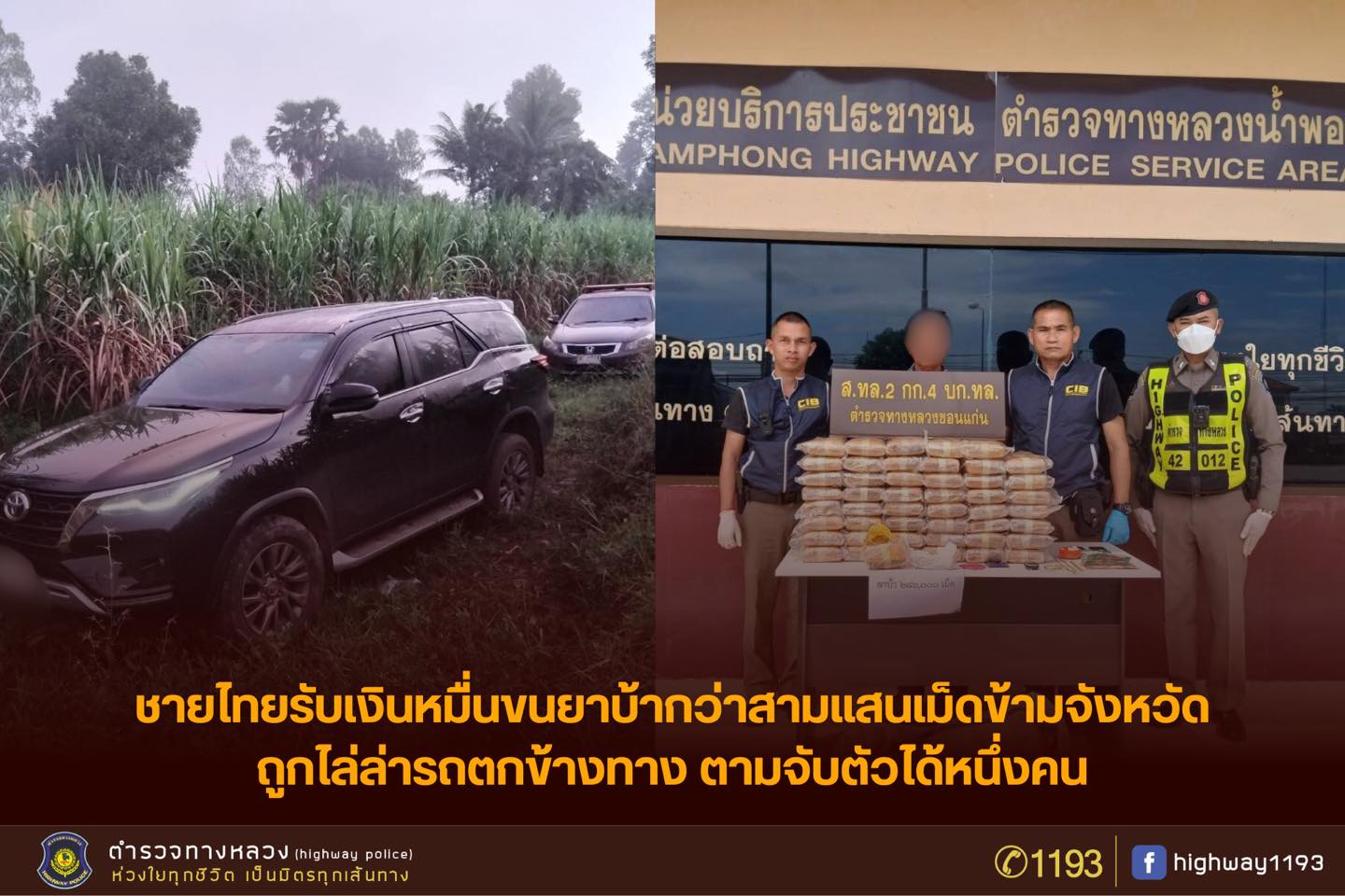 ตำรวจทางหลวงขอนแก่น ไล่ล่ารถขนยาบ้าเกือบ 3 แสนเม็ด ทิ้งของกลางไว้ข้างทางและขับรถต่อไปจนเสียหลัก ตามจับกลับมาได้ 1 ราย