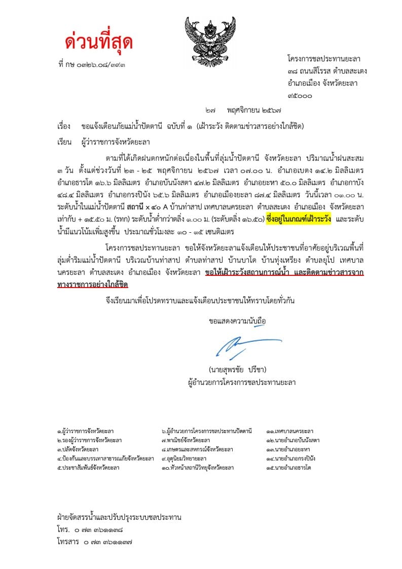 เมื่อวันที่ 27 พ.ย.67 เพจ โครงการชลประทานยะลา ได้โพสต์ข้อความระบุว่า คป,ยะลา ขอแจ้งเตือนภัยสถานการณ์แม่น้ำ ปัตตานี ฉบับที่ 3 (ระดับน้ำอยู่ในเกณฑ์เฝ้าระวัง มีแนวโน้มเพิ่มขึ้มขึ้นอย่างต่อเนื่อง ขอให้ติดตามข่าวสารอย่างใกล้ชิด) วันที่ 27 พฤศจิกายน 2567 โครงการชลประทานยะลา จึงขอให้จังหวัดยะลาแจ้งเตือนให้ประชาชนที่อาศัยอยู่ริมแม่น้ำ ปัตตานีบริเวณบ้านหัวสะพาน ตำบลบันนังสตา อำเภอบันนังสตา จังหวัดยะลา ให้เฝ้าระวังระดับน้ำที่อาจ สูงขึ้น ทั้งนี้ขอให้ติดตามสถานการณ์น้ำและข่าวสารจากทางราชการอย่างใกล้ชิด