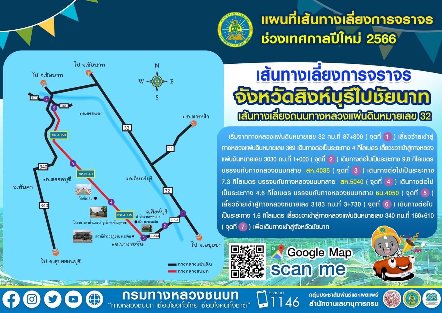- เส้นทางเลี่ยง ทล.32 เริ่มจาก ทล.32 กม.ที่ 87+800 (จุดที่ 1) เลี้ยวซ้ายเข้าสู่ ทล.369 เดินทางต่อเป็นระยะทาง 4 กิโลเมตร เลี้ยวขวาเข้าสู่ ทล.3030 กม.ที่ 1+000 (จุดที่ 2) เดินทางต่อไปเป็นระยะทาง 9.8 กิโลเมตร บรรจบกับทางหลวงชนบทสาย สห.4035 (จุดที่ 3) เดินทางต่อไปเป็นระยะทาง 7.3 กิโลเมตร บรรจบกับทางหลวงชนบทสาย สห.5040 (จุดที่ 4) เดินทางต่อไปเป็นระยะทาง 4.6 กิโลเมตร บรรจบกับทางหลวงชนบทสาย ชน.4050 (จุดที่ 5) เลี้ยวซ้ายเข้าสู่ ทล.3183 กม.ที่ 3+730 (จุดที่ 6) เดินทางต่อไปเป็นระยะทาง 1.6 กิโลเมตร เลี้ยวขวาเข้าสู่ ทล.340 กม.ที่ 160+610 (จุดที่ 7) เพื่อเดินทางเข้าสู่จังหวัดชัยนาท