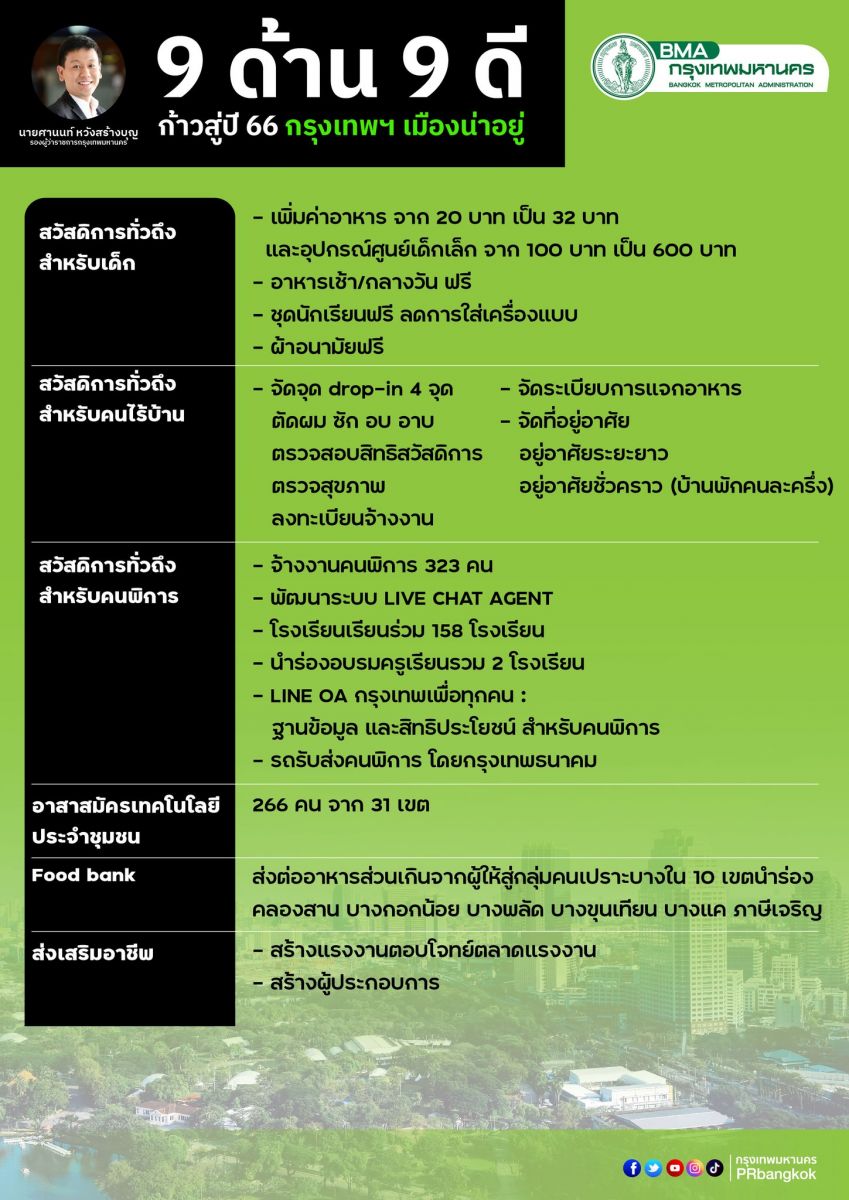 สรุปประเด็นแถลงข่าว “9 ด้าน 9 ดี ก้าวสู่ปี 66 กรุงเทพฯ เมืองน่าอยู่” ทบทวนการทำงานที่ผ่านมา 6 เดือน 21 วัน ส่งของขวัญคนกรุงฯ พร้อมขอบคุณประชาชนและทุกภาคส่วน ที่ร่วมกันพัฒนาเมือง เพื่อให้กรุงเทพฯเป็นเมืองที่น่าอยู่สำหรับทุกคน