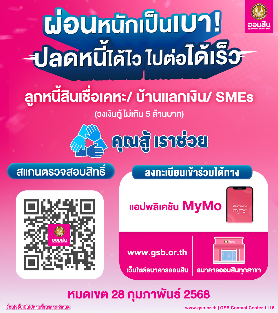 ออมสิน กระตุ้นลูกหนี้ลงทะเบียนเข้าโครงการ “คุณสู้ เราช่วย” จะหมดหนี้เร็วขึ้น เดดไลน์วันสุดท้าย 28 ก.พ. 68 ทางแอป MyMo หรือที่เว็บออมสิน www.gsb.or.th