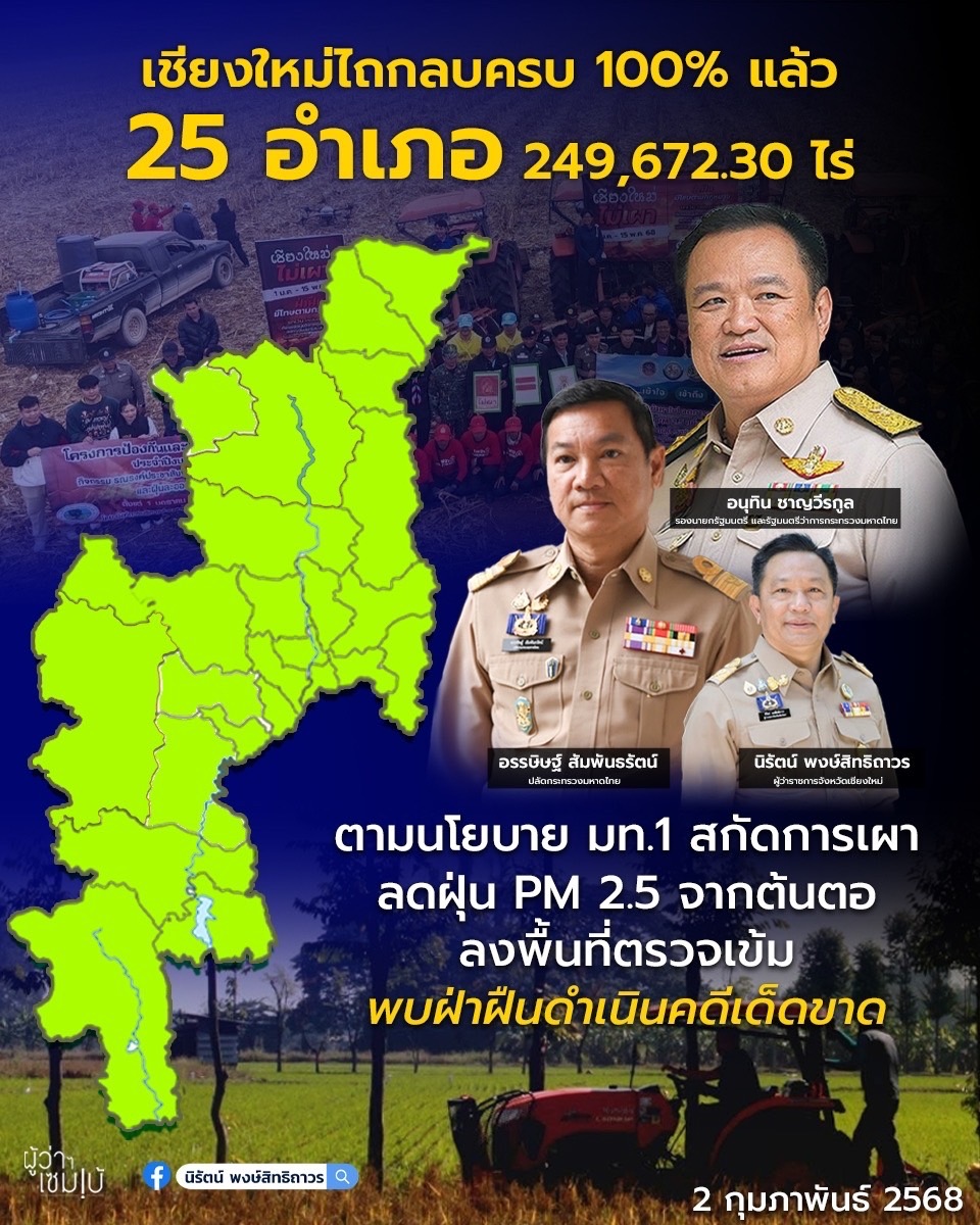 ซึ่งเป็นตามตามนโยบายของ นายอนุทิน ชาญวีรกูล รองนายกรัฐมนตรีและรัฐมนตรีว่าการกระทรวงมหาไทย ในการสกัดการเผา ลดฝุ่น PM 2.5 จากต้นตอ ลงพื้นที่ตรวจเข้ม พบฝ่าฝืนดำเนินคดีเด็ดขาด