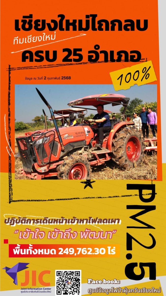 ซึ่งล่าสุดจังหวัดเชียงใหม่ ได้ดำเนินการไถกลบเพื่อลดการเผาในพื้นที่เกษตรครบ 100 % แล้ว ใน 25 อำเภอ 249,672.30 ไร่ ได้แก่ แม่อาย ฝาง ไชยปราการ พร้าว เชียงดาว เวียงแหง แม่แตง สะเมิง กัลยาณิวัฒนา เมืองเชียงใหม่ แม่ริม สารภี สันทราย สันกำแพง แม่ออน หางดง ดอยสะเก็ด สันป่าตอง ดอยหล่อ แม่วาง จอมทอง แม่แจ่ม ฮอด ดอยเต่า และอมก๋อย