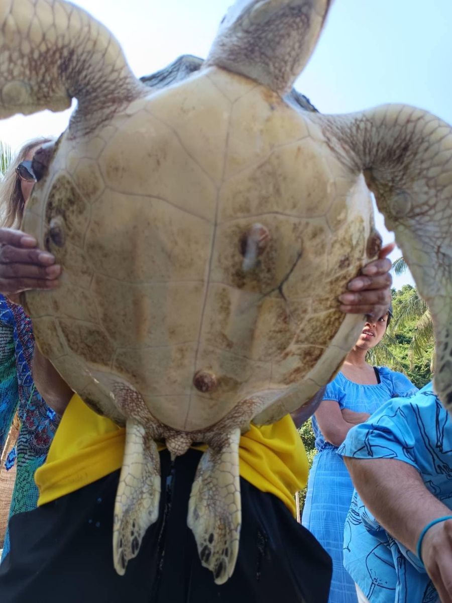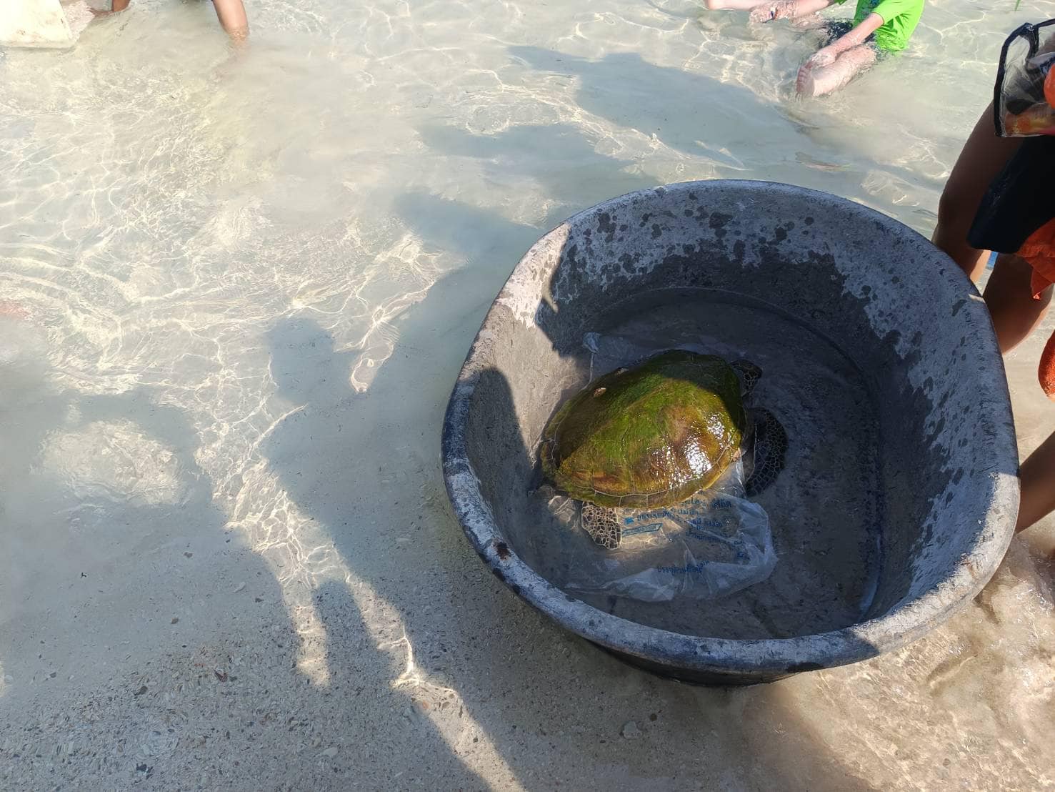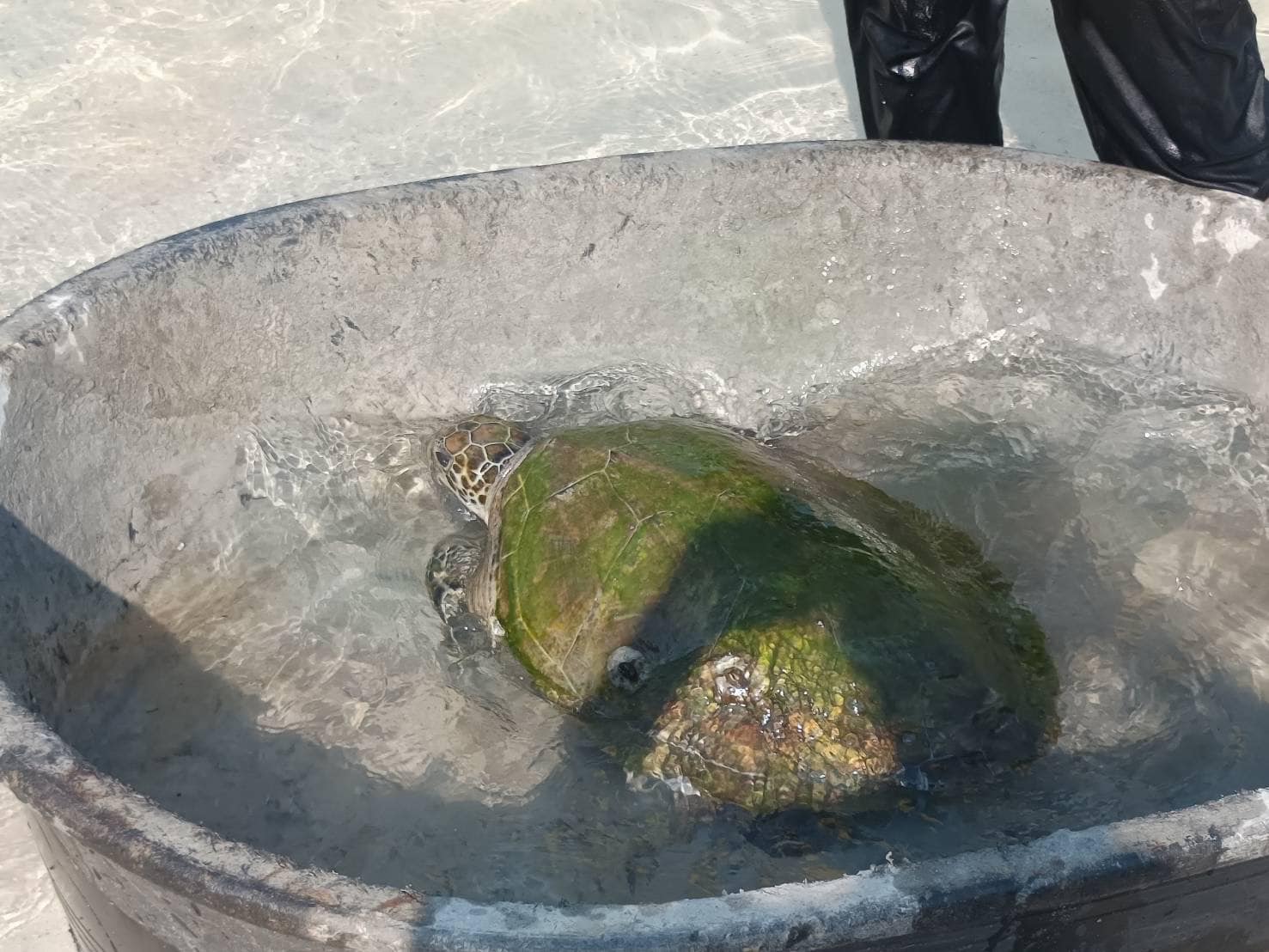 จากการตรวจสอบบริเวณใต้กระดองพบบาดแผลยาว 13 เซนติเมตร จึงทำการจัดเก็บข้อมูล ก่อนนำขึ้นเพื่อไปทำการอนุบาลเบื้องต้น และได้มีการประสานไปยังศูนย์วิจัยทรัพยากรทางทะเลและชายฝั่งอ่าวไทยตอนกลาง จังหวัดชุมพร กรมทรัพยากรทางทะเลและชายฝั่ง ส่งต่อไปทำการรักษาและอนุบาล เพื่อปล่อยคืนสู่ธรรมชาติต่อไป