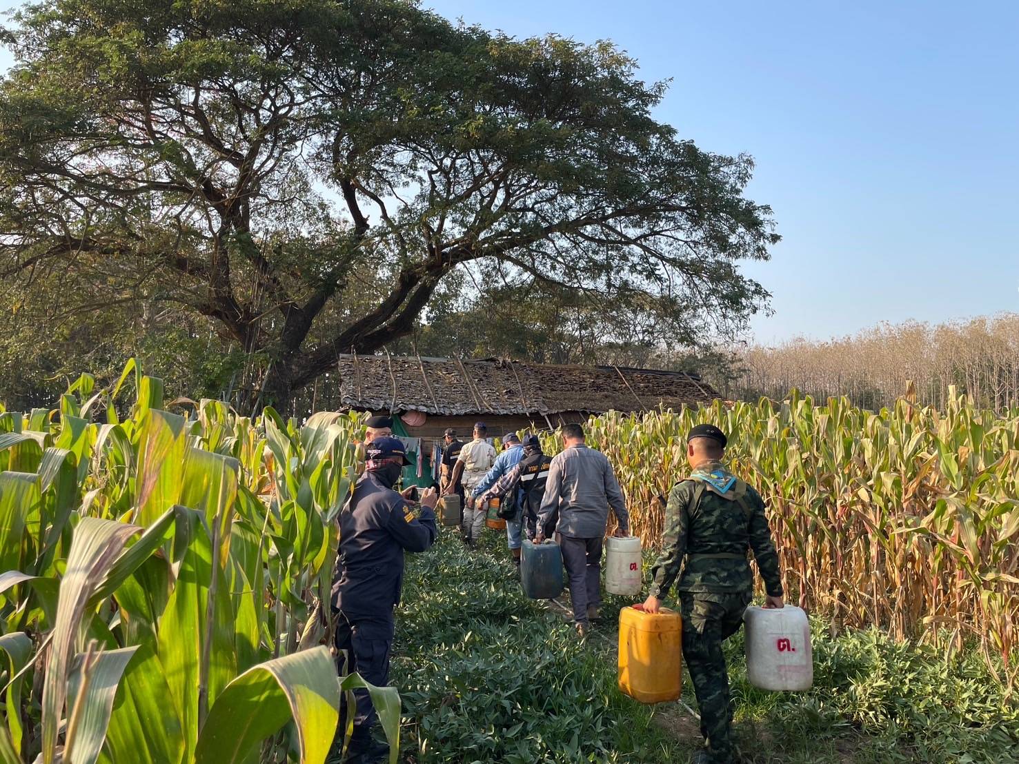 เมื่อเวลา 16.30 น. วันที่ 9 ก.พ.68 หน่วยเฉพาะกิจราชมนู (ฉก.ราชมนู) โดย หมวดเคลื่อนที่เร็วกองกำลังนเรศวร (มว.คทร.กกล.นเรศวร) ร่วมกับ เจ้าหน้าที่ตำรวจ สภ.เเม่สอด, ฝ่ายปกครอง, ตชด.346 ลาดตระเวน และเฝ้าตรวจบริเวณพื้นที่รับผิดชอบ พื้นที่ไร่ข้าวโพด ริมเเม่น้ำเมย บ้านดอนไชย หมู่ 6 ต.เเม่ตาว อ. เเม่สอด จ.ตาก โดยได้ตรวจพบถังน้ำมันขนาดบรรจุ 20 ลิตร จำนวน 9 ถัง (จำนวนทั้งสิ้น 160 ลิตร) วางกระจายอยู่ในพื้นที่ ไม่พบผู้ต้องสงสัย ที่เข้ามาทำการซ่อนพรางน้ำมัน ซึ่งคาดว่าช่วงเวลากลางคืนจะมีกลุ่มที่นัดหมายมารับน้ำมัน ส่งไปขายในประเทศเมียนมา จึงได้ร่วมทำการตรวจยึดถังน้ำมันดีเซล จำนวน 9 ถัง (160 ลิตร) เพื่อตรวจสอบ เเละดำเนินการตามกฎหมายต่อไป