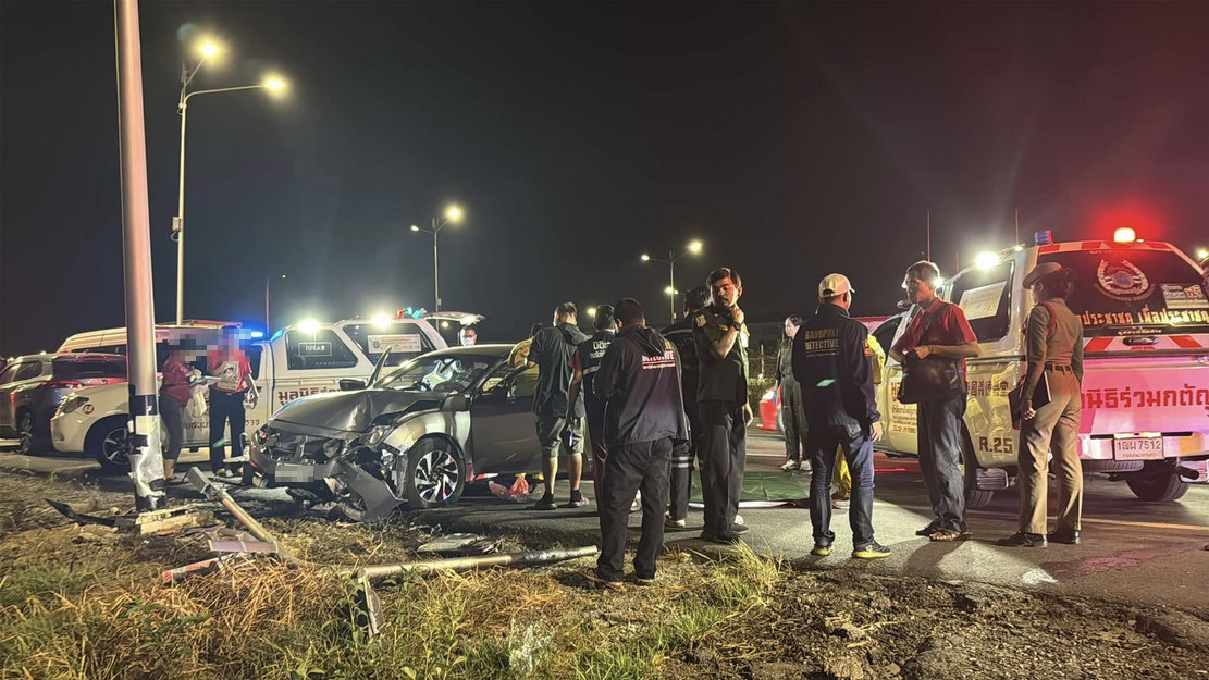 ลูกขับรถพาครอบครัวกลับจากทำบุญ เกิดหลับในพุ่งชนเสาไฟข้างทาง มารดานั่งเบาะหลังเสียชีวิต คาดไม่ได้รัดเข็มขัดนิรภัย จ.สมุทรปราการ