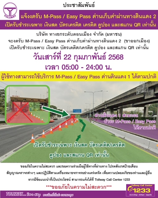 ด่านดินแดง 2 ปิดรับ M-Pass / Easy Pass รับเฉพาะเงินสด บัตรเครดิต/เดบิต คูปองแลสแกน QR เท่านั้น ผู้ใช้ทางสามารถผ่านทางด้วย M-Pass / Easy Pass ที่ด่านดินแดง 1 ได้ตามปกติ
