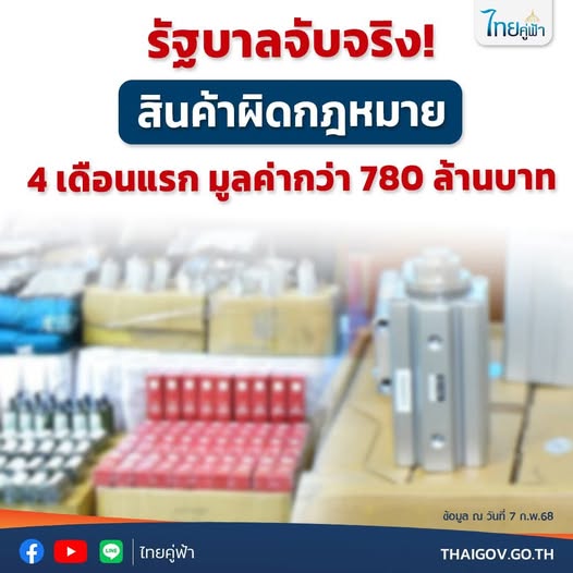 รัฐบาล โดย กรมศุลกากร รายงานผลการจับกุมสินค้าผิดกฎหมายช่วง 4 เดือนแรกของปีงบฯ 68 (ต.ค. 67 - ม.ค. 68) มูลค่ากว่า 780 ล้านบาท เพิ่มขึ้นจากช่วงเดียวกันของปีก่อนถึง 25% เป็นผลมาจากมาตรการตรวจสอบที่เข้มงวดขึ้นตามนโยบายรัฐบาล โดยมุ่งเน้นการสกัดกั้นการลักลอบนำเข้าและส่งออกสินค้าผิดกฎหมาย