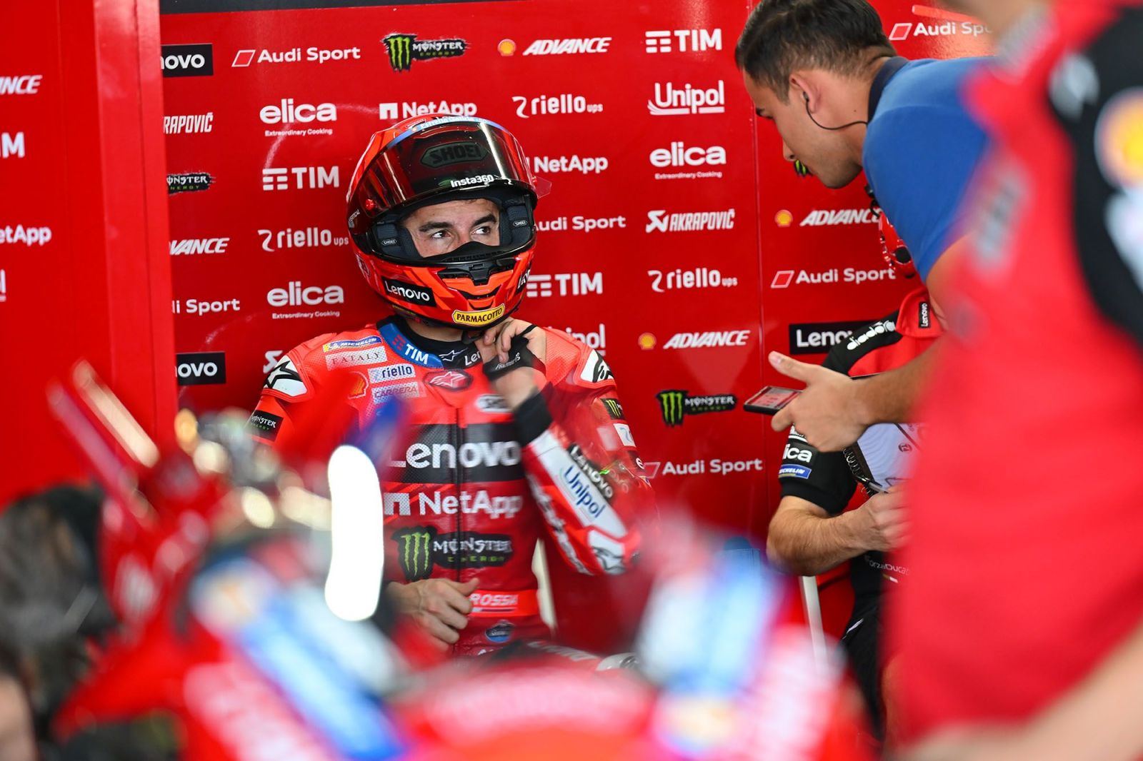 มาร์ค มาร์เกซ แชมป์โลก ชาวสแปนิช จากทีมโรงงานดูคาติ เค้นเวลาช่วงท้ายขยับขึ้นรั้งจ่าฝูง ในการทดสอบวันแรก “ThaiGP Pre-season Test” สนามช้าง อินเตอร์เนชั่นแนล เซอร์กิต จ.บุรีรัมย์ ขณะ “ก้อง” สมเกียรติ ลงบิดรถแข่งโมโตจีพีในบ้านเกิดครั้งแรกในชีวิต รั้งอันดับ 20