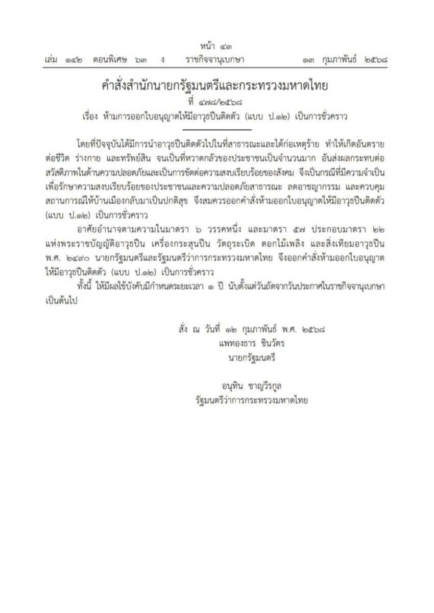 น.ส.ไตรศุลี ไตรสรณกุล เลขานุการ รมว.มหาดไทยและโฆษกกระทรวงมหาดไทย กล่าวว่า เมื่อวันที่ 12 ก.พ. 68 น.ส.แพทองธาร ชินวัตร นายกรัฐมนตรี และนายอนุทิน ชาญวีรกูล รองนายกรัฐมนตรี และ รมว.มหาดไทย ได้ลงนามในคำสั่งสำนักนายกรัฐมนตรีและกระทรวงมหาดไทย ที่ 478/2568 เรื่อง ห้ามการออกใบอนุญาตให้มีอาวุธปืนติดตัว (แบบ ป.12) เป็นการชั่วคราว มีสาระสำคัญเป็นการห้ามไม่ให้เจ้าหน้าที่นายทะเบียนออกใบอนุญาตพกพาอาวุธปืนเป็นเวลา 1 ปี นับแต่วันถัดจากวันประกาศในราชกิจจานุเบกษา
