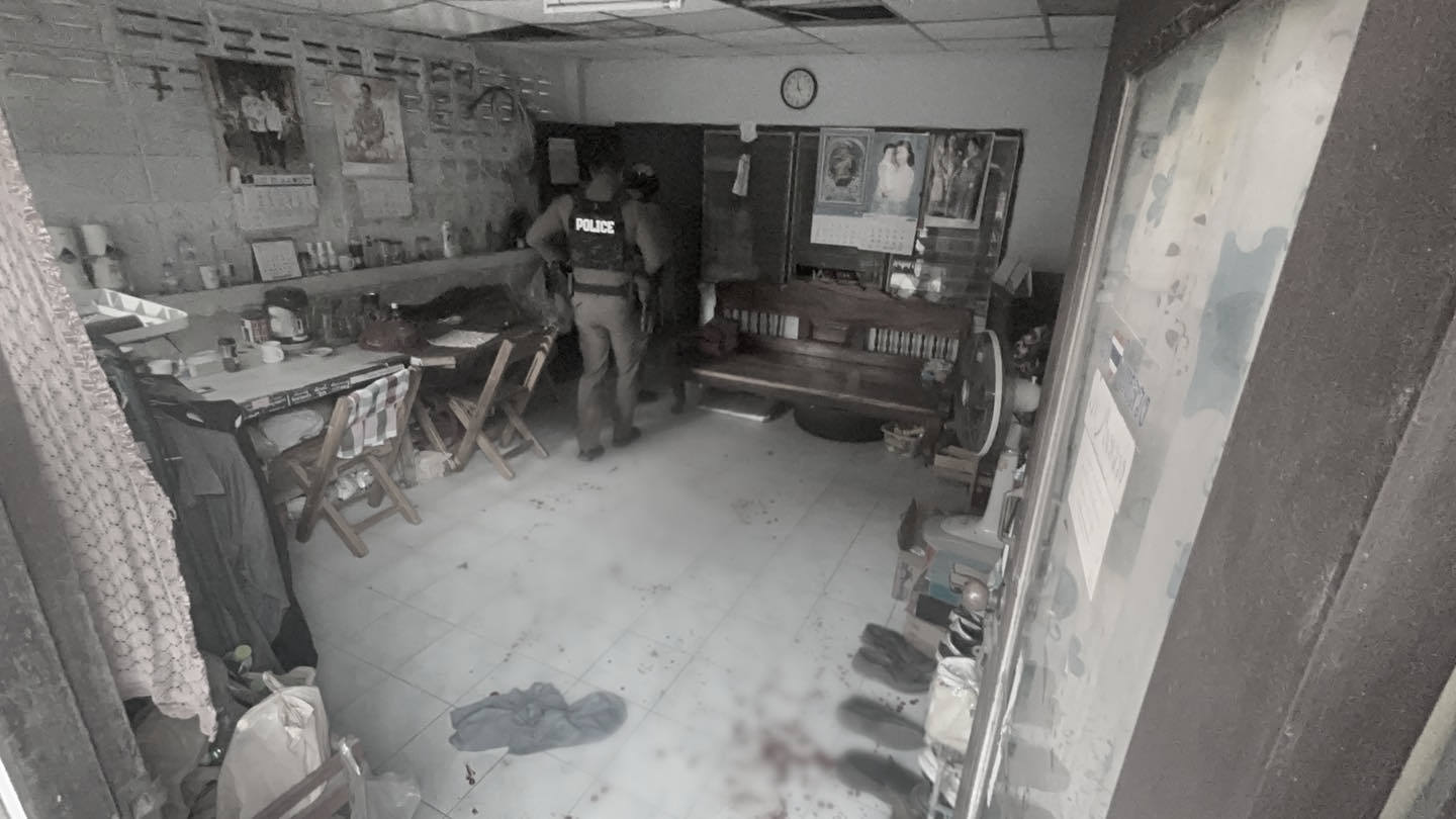 ที่เกิดเหตุ บริเวณหน้าประตูบ้านพบคราบเลือดหยดไหลเป็นทาง โดยมีผู้ได้รับบาดเจ็บ ทราบชื่อภายหลังคือ นายกอ (นามสมมุติ) อายุ 41 ปี ถูกอาวุธมีดฟันเข้าที่แขนซ้าย เป็นแผลฉกรรจ์ เสียเลือดมาก เจ้าหน้าที่กู้ภัยฯ จึงให้การช่วยเหลือ ปฐมพยาบาลเบื้องต้น ก่อนเคลื่อนย้ายส่งโรงพยาบาลอย่างเร่งด่วน ส่วนผู้ก่อเหตุ ได้หลบหนีไปก่อนที่เจ้าหน้าที่จะมาถึงแล้ว