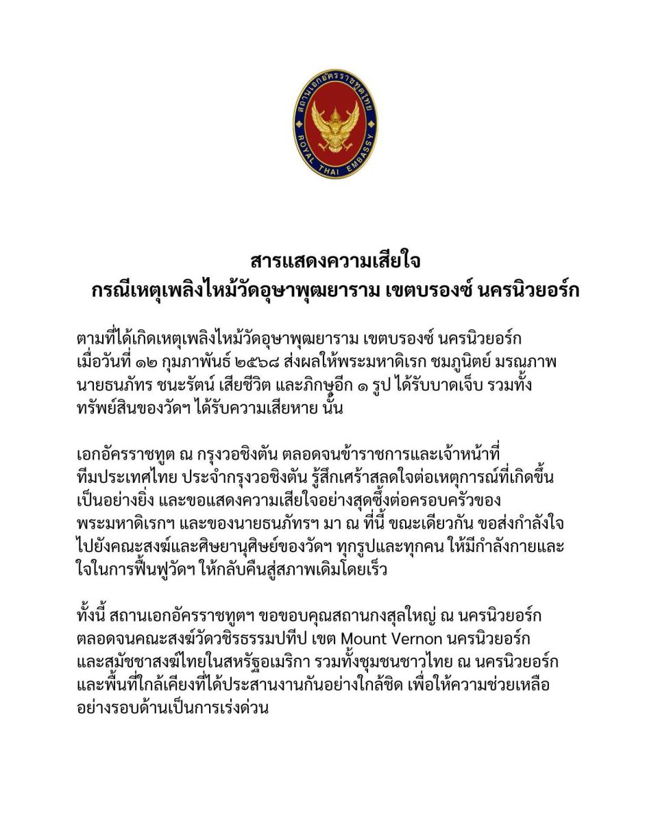 ตามที่ได้เกิดเหตุเพลิงไหม้วัดอุษาพุฒยาราม เขตบรองซ์ นครนิวยอร์ก เมื่อวันที่ ๑๒ กุมภาพันธ์ ๒๕๖๘ ส่งผลให้พระมหาดิเรก ชมภูนิตย์ มรณภาพ นายธนภัทร ชนะรัตน์ เสียชีวิต และภิกษุอีก ๑ รูป ได้รับบาดเจ็บ รวมทั้งทรัพย์สินของวัดฯ ได้รับความเสียหาย นั้น