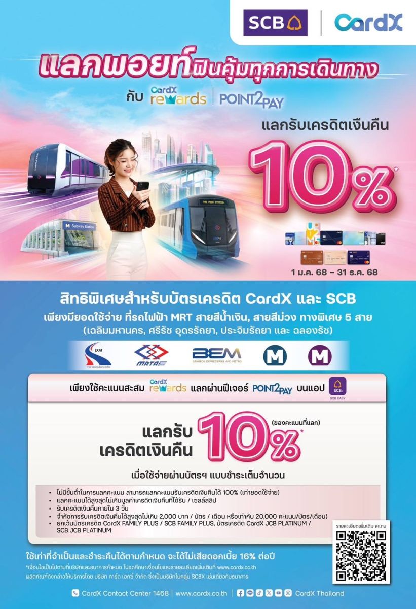 6. บริษัท คาร์ด เอกซ์ จำกัด มอบสิทธิประโยชน์ให้แก่ผู้ใช้บริการรถไฟฟ้าที่มียอดใช้จ่ายรูดหรือแตะผ่านบัตรเครดิตคาร์ดเอกซ์/ไทยพาณิชย์ จะได้รับเครดิตเงินคืน 10% ของคะแนนที่ใช้แลก (จำกัดเครดิตเงินคืนสูงสุด 2,000 บาท/เดือน) ตั้งแต่วันที่ 1 มกราคม – 31 ธันวาคม 2568 รายละเอียดเพิ่มเติมโทร. ศูนย์บริการลูกค้าคาร์ดเอกซ์ โทร.1468 สำหรับบัตรเครดิตคาร์ดเอกซ์ หรือ ศูนย์บริการลูกค้าไทยพาณิชย์ โทร. 02-777-7777 สำหรับบัตรเครดิตไทยพาณิชย์ (หมายเหตุ: เฉพาะ MRT สายสีน้ำเงิน โปรโมชันร่วมการแตะจ่ายผ่านบัตรเท่านั้น)