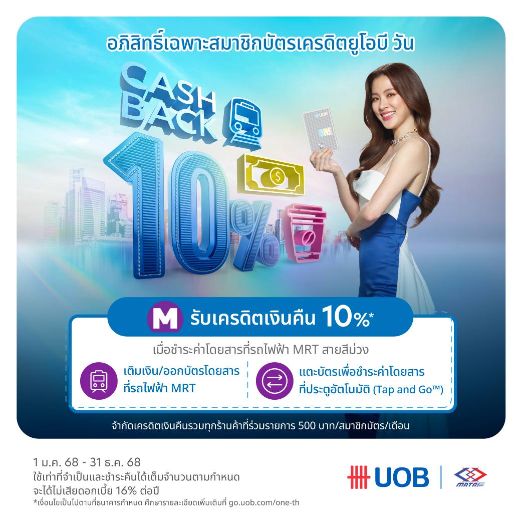 4. ธนาคารยูโอบี จำกัด (มหาชน) มอบสิทธิพิเศษให้ผู้ใช้บริการที่มียอดใช้จ่ายรูดหรือแตะผ่านบัตรยูโอบี วัน ตั้งแต่วันที่ 1 มกราคม – 31 ธันวาคม 2568 และผ่านบัตรเครดิตยูโอบี โยโล่ แพลทินัม ตั้งแต่วันที่ 1 เมษายน – 31 ธันวาคม 2568 ที่รถไฟฟ้า MRT สายสีน้ำเงินและสายสีม่วง จะได้รับเครดิตเงินคืน 10% โดยจำกัดการรับเครดิตเงินคืนรวมสูงสุด 500 บาท/คน/เดือน ตั้งแต่วันที่ 1 มกราคม – 31 ธันวาคม 2568 รายละเอียดเพิ่มเติมโทร. 0 2285 1555 หรือ www.uob.co.th (หมายเหตุ: เฉพาะ MRT สายสีน้ำเงิน โปรโมชันร่วมการแตะจ่ายผ่านบัตรเท่านั้น)